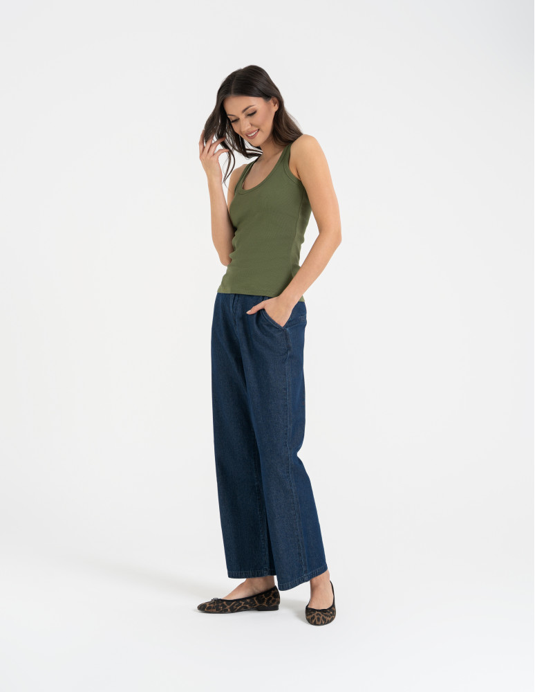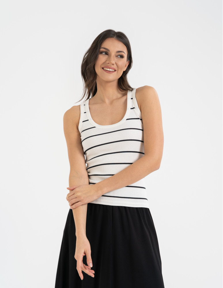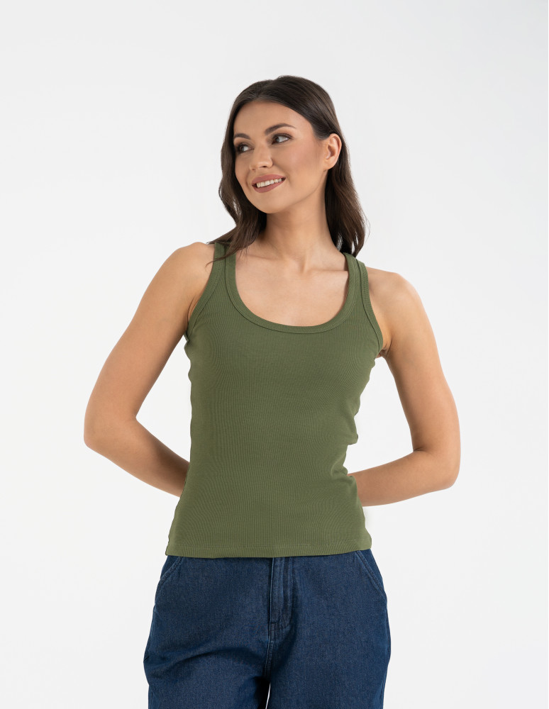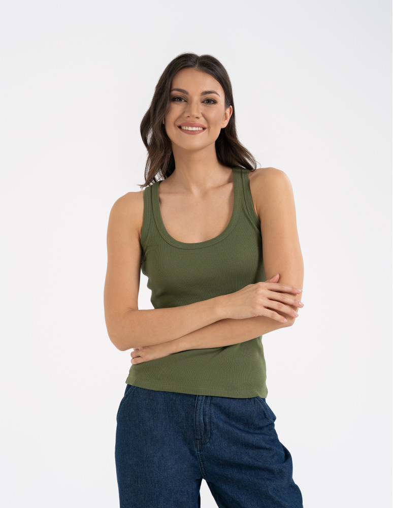 Damska koszulka typu tank top wykonana z elastycznej, prążkowanej dzianiny bawełnianej z dodatkiem elastanu. Model w fasonie bokserki doskonale dopasowuje się do sylwetki, podkreślając jej kształt i zapewniając pełną swobodę ruchów.