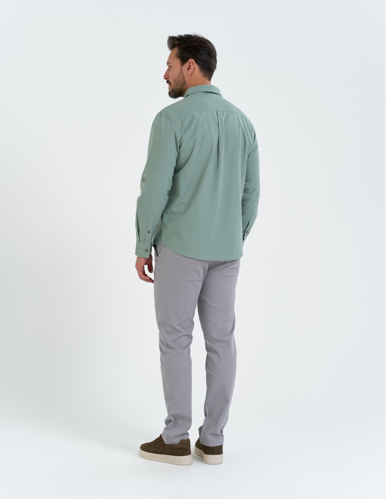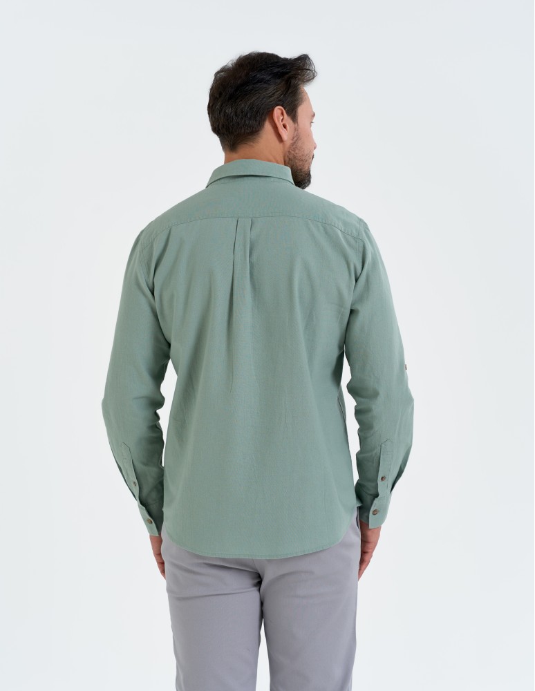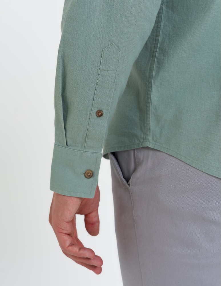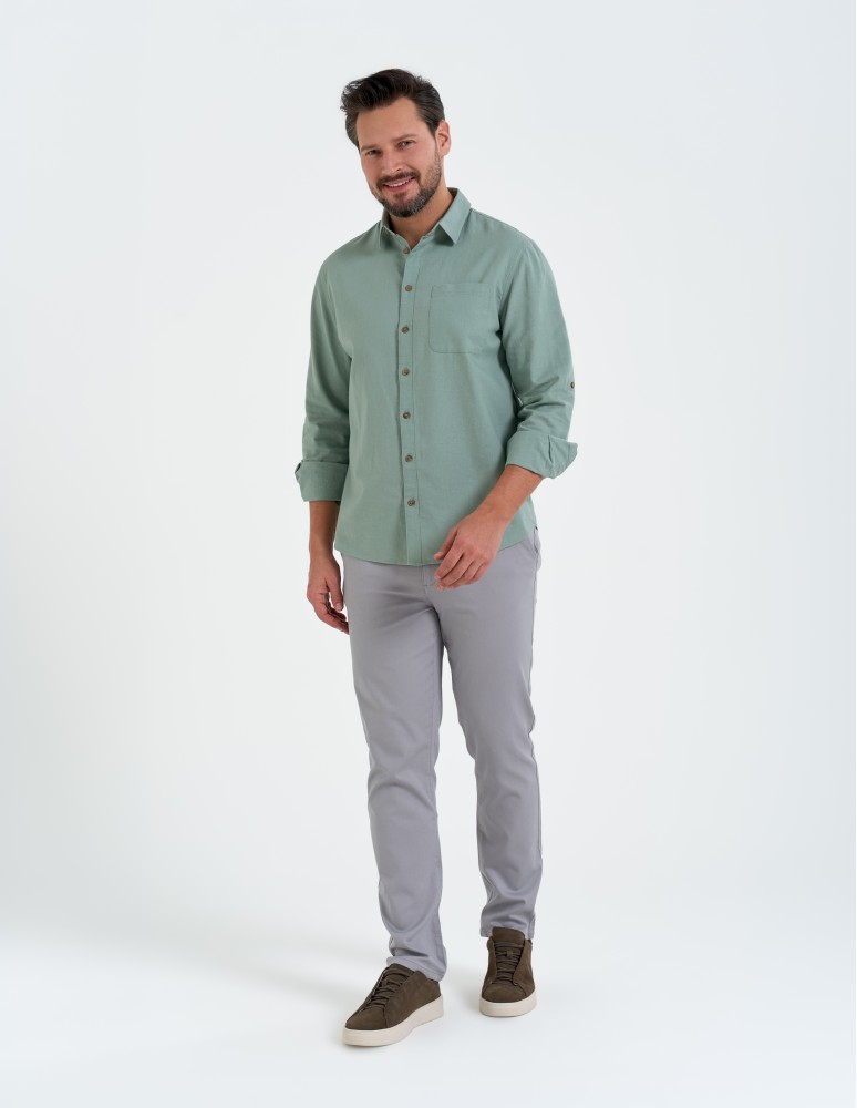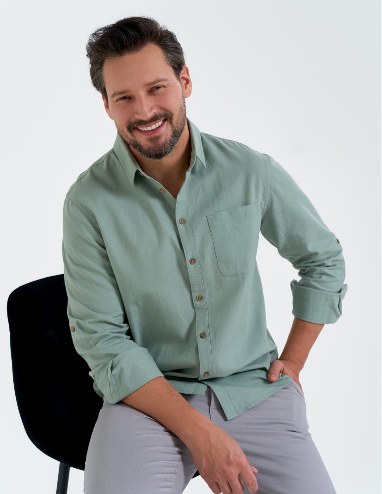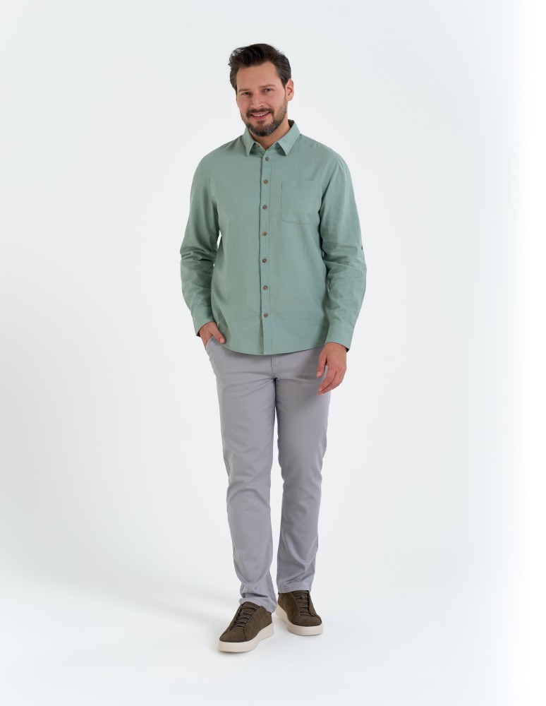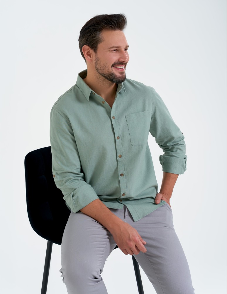 To lniana koszula męska, która sprawdzi się w zestawieniu z chinosami, jeansami czy letnimi spodniami z lekkiej tkaniny.