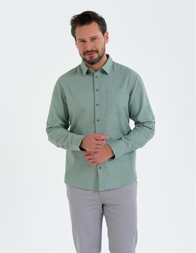 Koszula posiada klasyczny kołnierzyk oraz kieszeń na piersi, która podkreśla jej uniwersalny charakter. Rękawy z możliwością regulacji pozwalają nosić ją zarówno w wersji z długim, jak i podwiniętym krótkim rękawem – w zależności od pogody i okazji. Regularny krój gwarantuje swobodę ruchów i wygodne dopasowanie.