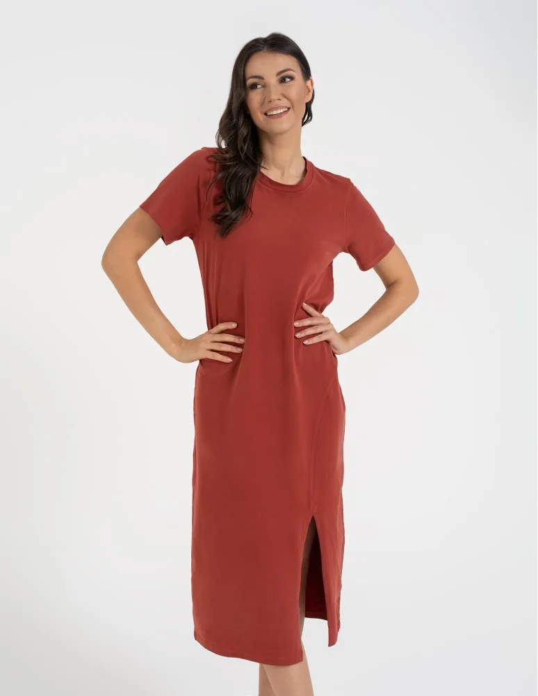 Damska sukienka o prostym, kolumnowym kroju, która stanowi kwintesencję minimalistycznej elegancji w codziennym wydaniu. Nowoczesna forma typu t-shirt dress została urozmaicona efektownymi, głębokimi rozcięciami po bokach, które nadają całości lekkości i subtelnie eksponują nogi. Klasyczny, okrągły dekolt oraz krótki rękaw sprawiają, że sukienka prezentuje się estetycznie i schludnie, stanowiąc doskonałą bazę dla wielu zróżnicowanych stylizacji.
