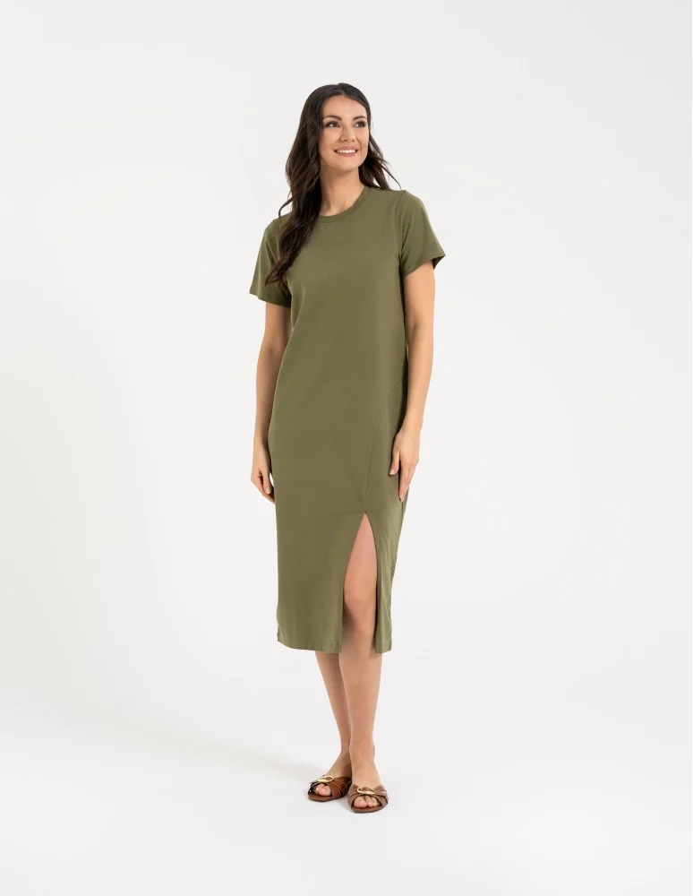 Damska sukienka o prostym, kolumnowym kroju, która stanowi kwintesencję minimalistycznej elegancji w codziennym wydaniu. Nowoczesna forma typu t-shirt dress została urozmaicona efektownymi, głębokimi rozcięciami po bokach, które nadają całości lekkości i subtelnie eksponują nogi. Klasyczny, okrągły dekolt oraz krótki rękaw sprawiają, że sukienka prezentuje się estetycznie i schludnie, stanowiąc doskonałą bazę dla wielu zróżnicowanych stylizacji.