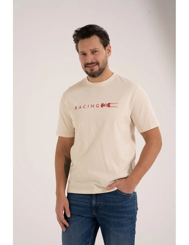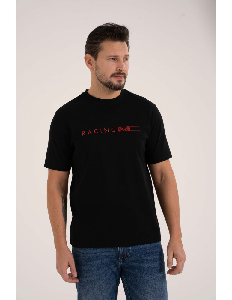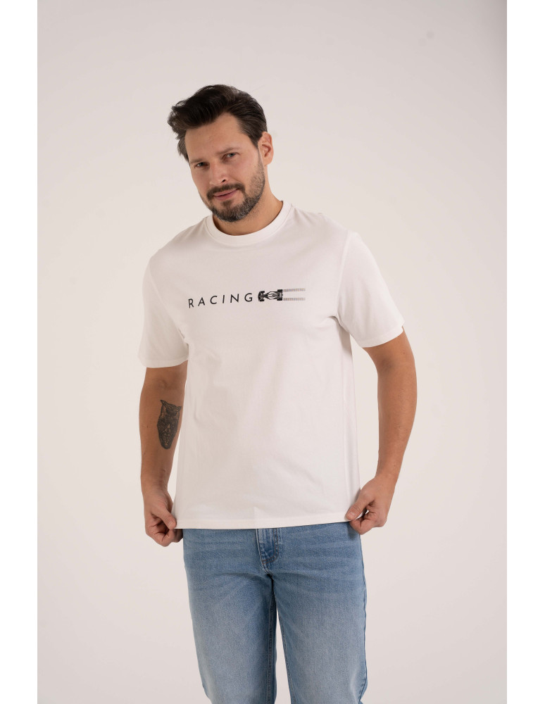 Męska koszulka z krótkim rękawem o regularnym kroju, łącząca wygodę i sportowy charakter. Wykonana z miękkiej, oddychającej tkaniny, idealnie sprawdzi się na co dzień. Na przodzie znajduje się jednokolorowy nadruk „RACING” wykonany w technikach mieszanych, który dodaje koszulce dynamicznego i nowoczesnego wyglądu.