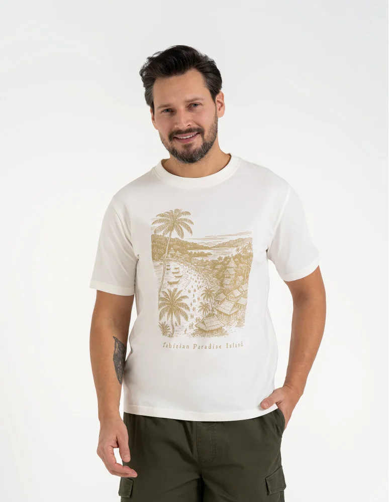 Ten męski t-shirt z krótkim rękawem to połączenie wygody i komfortu. Wykonany z miękkiej bawełny z efektem "peach touch", który nadaje mu przyjemną w dotyku strukturę. Klasyczny krój z dekoracyjnymi przeszyciami przy dekolcie zapewnia ponadczasowy wygląd, który sprawdzi się w wielu stylizacjach. Koszulka ozdobiona jest subtelnym nadrukiem przedstawiającym krajobraz wyspy Tahiti, który nadaje jej wakacyjny charakter. Miękki nadruk gwarantuje wygodę, nie tracąc przy tym intensywności koloru. Idealna do codziennych, casualowych zestawów z jeansami lub szortami.