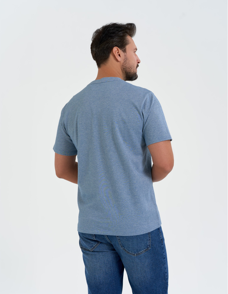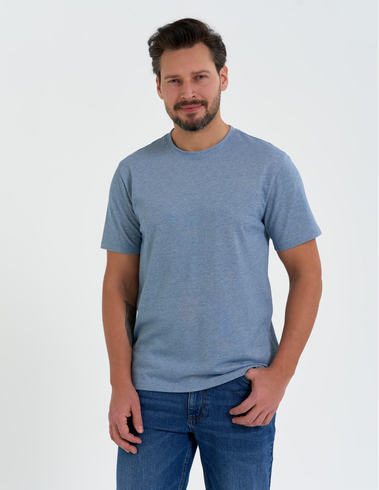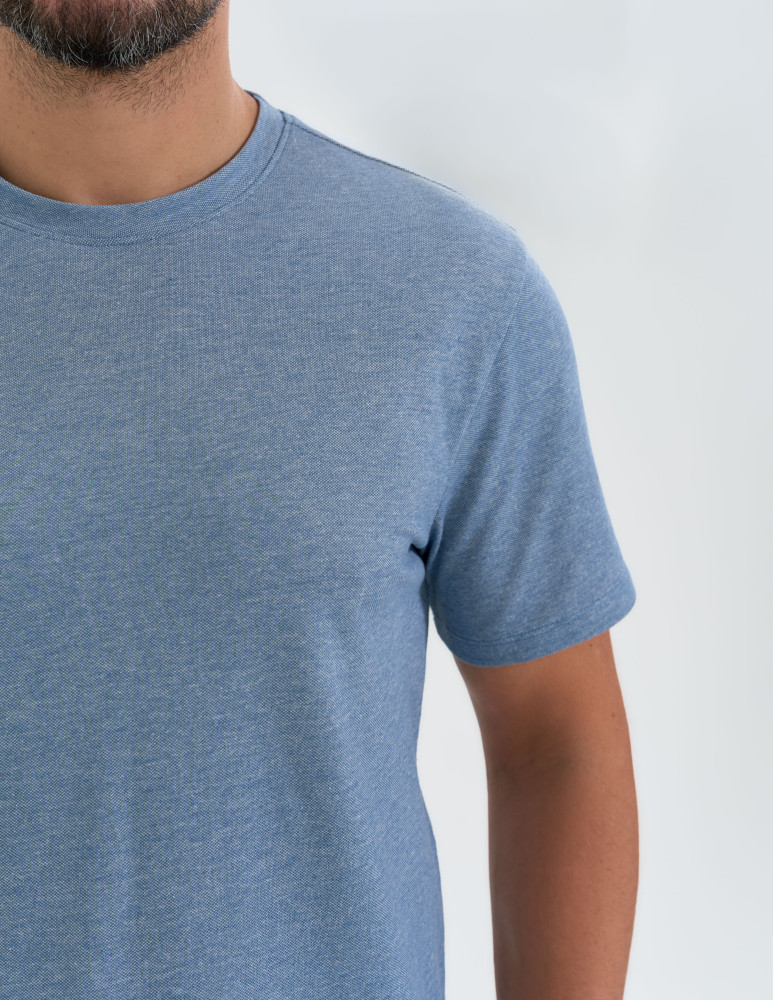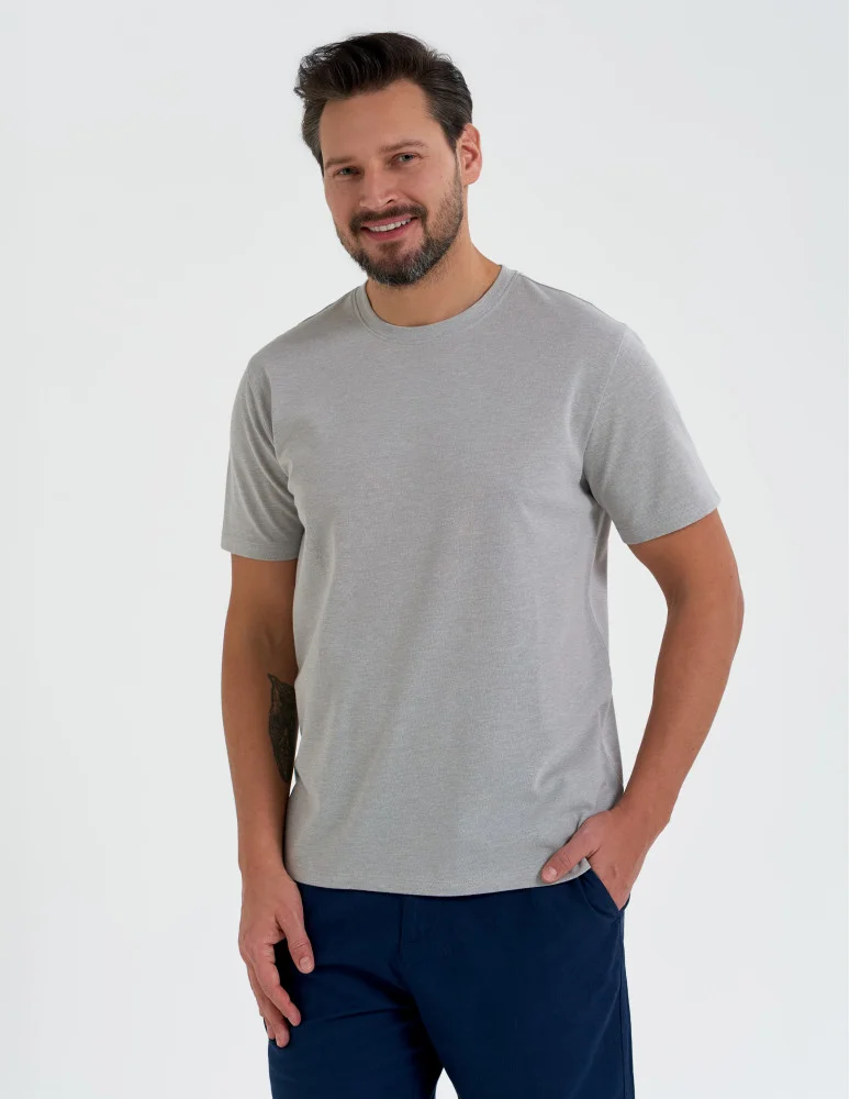 Męska koszulka typu basic wykonana z wysokiej jakości dzianiny pique o melanżowym wykończeniu to uniwersalny element garderoby na co dzień i na bardziej eleganckie okazje. Klasyczny krój regular fit zapewnia wygodę noszenia i swobodę ruchów, a jednocześnie dobrze układa się na sylwetce.