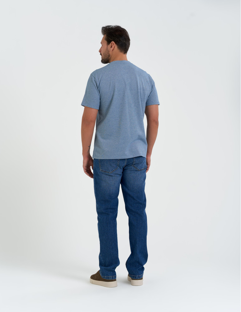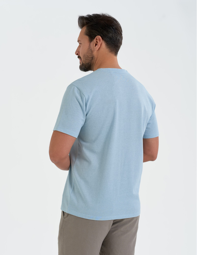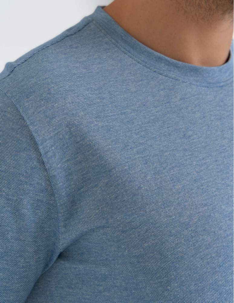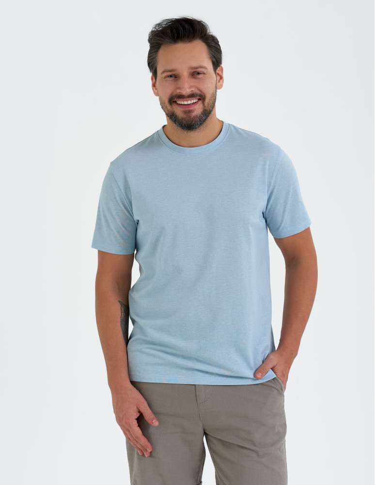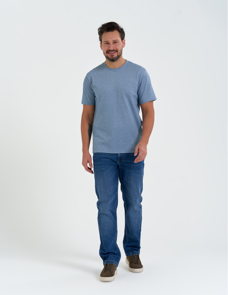 Męska koszulka typu basic wykonana z wysokiej jakości dzianiny pique o melanżowym wykończeniu to uniwersalny element garderoby na co dzień i na bardziej eleganckie okazje. Klasyczny krój regular fit zapewnia wygodę noszenia i swobodę ruchów, a jednocześnie dobrze układa się na sylwetce.