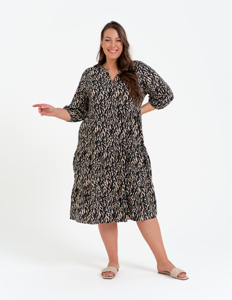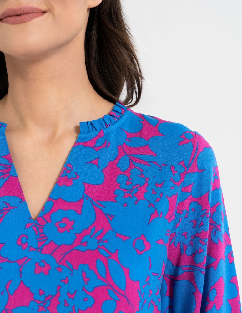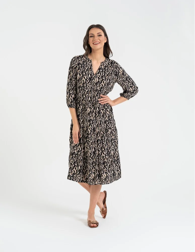 Sukienka ma luźny krój typu boxy, który zapewnia swobodę ruchów i komfort noszenia przez cały dzień. Delikatnie rozkloszowany dół oraz subtelne marszczenia nadają sylwetce lekkości, a jednocześnie nie opinają figury. To fason, który pięknie układa się w ruchu i pasuje do wielu typów sylwetek.