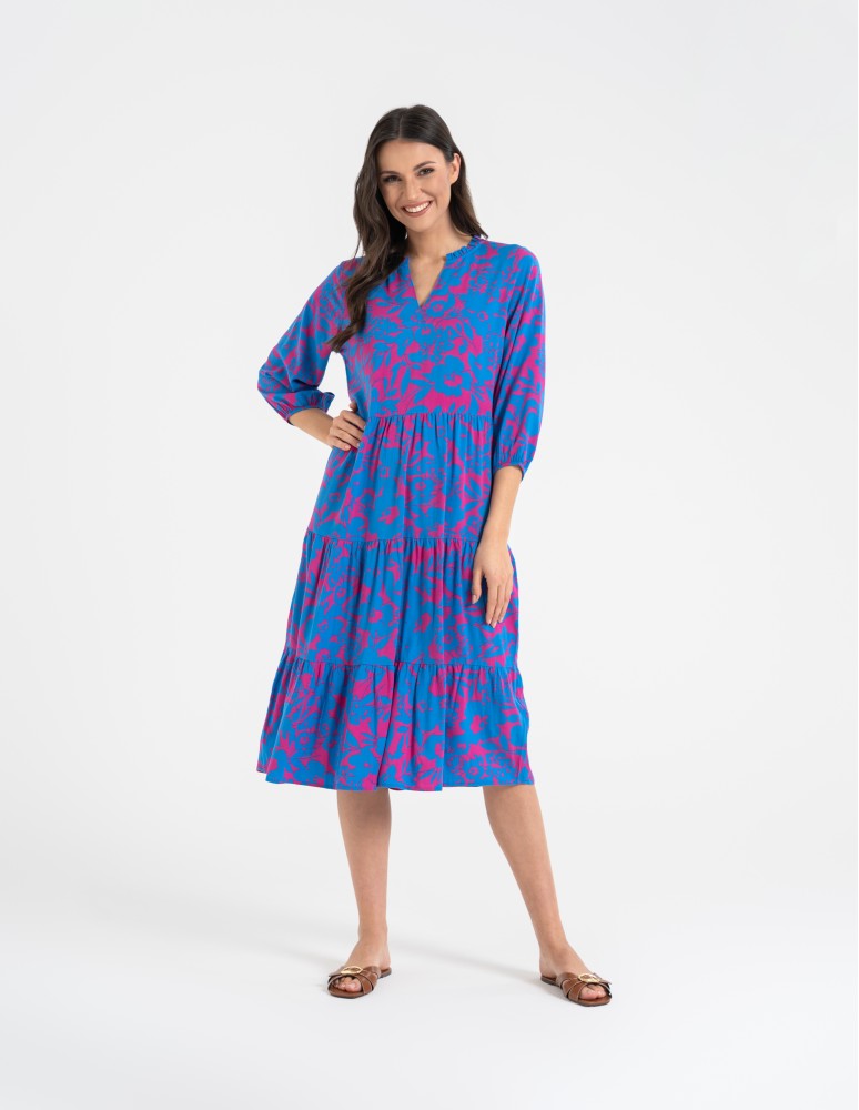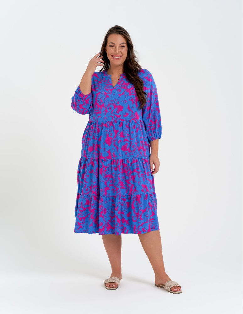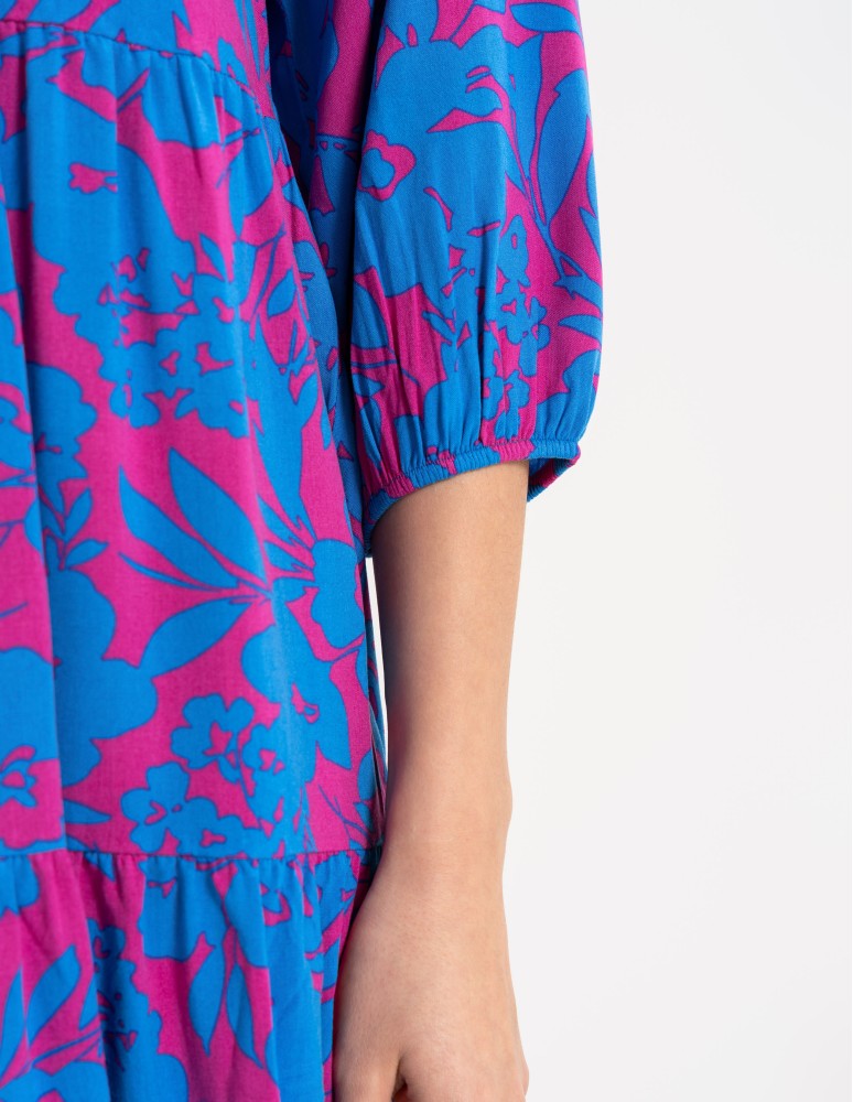 Model wyróżnia się kobiecym, wyrazistym printem, który nadaje stylizacji energii i świeżości. Sukienka sprawdzi się zarówno na co dzień – w zestawieniu z sandałami czy sneakersami – jak i podczas letnich spotkań.