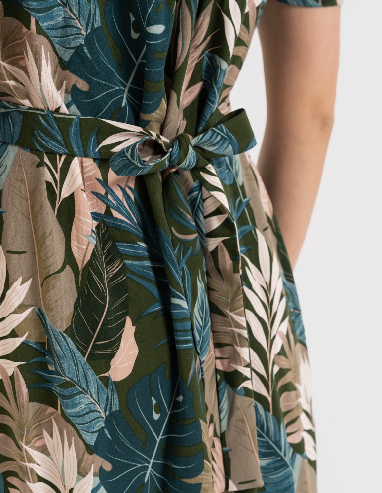 Sukienka posiada kopertową górę, która pięknie układa się na sylwetce i dopasowuje do wielkości biustu. Talia została podkreślona elastyczną gumką oraz wiązaniem dzięki czemu sukienka jest wygodna, dobrze dopasowuje się do sylwetki i podkreśla jej proporcje.
