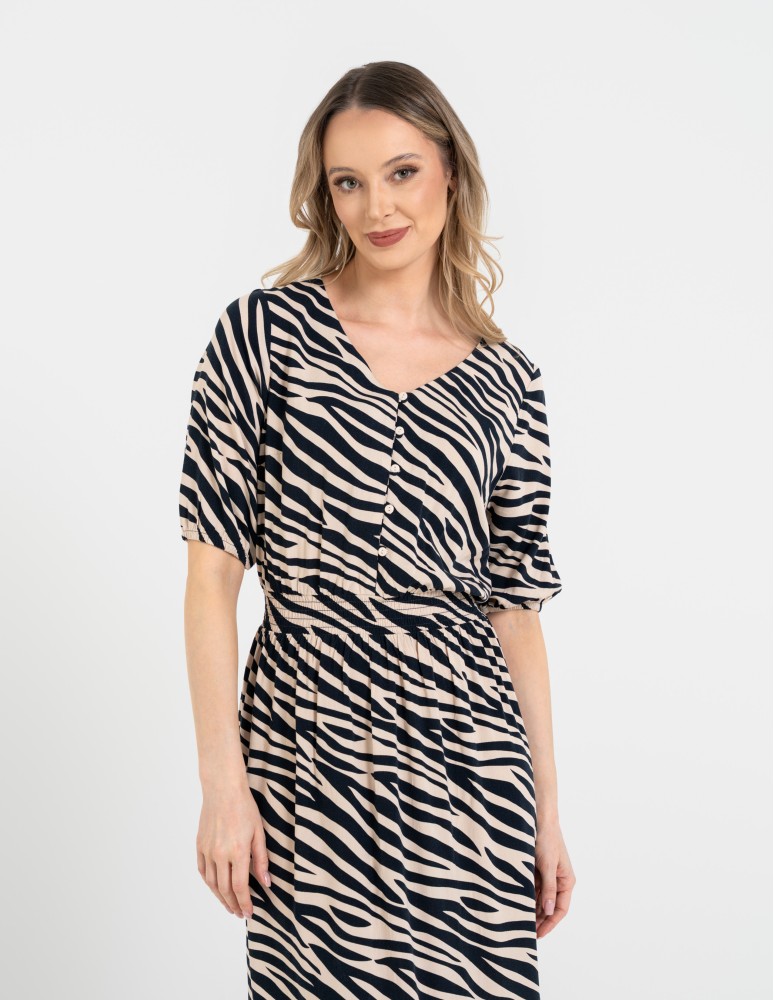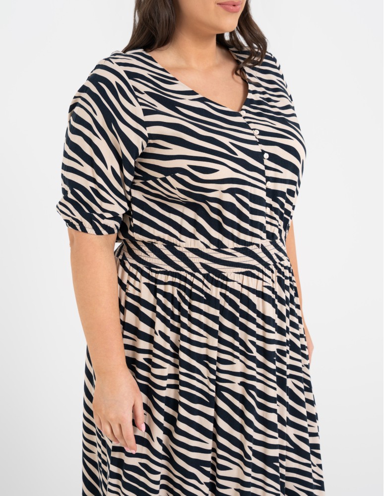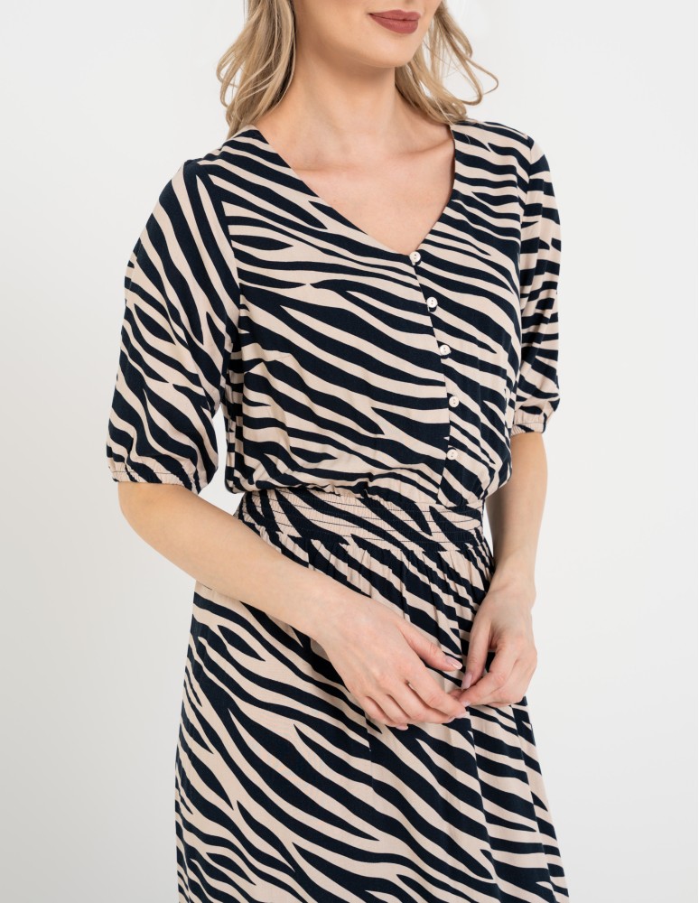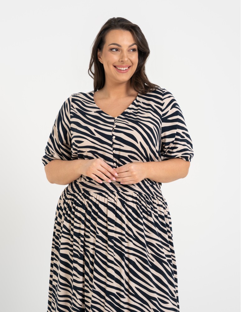 Sukienka posiada klasyczny dekolt z zapięciem na guziki oraz rękawy o długości do łokcia, które nadają całości eleganckiego charakteru. W talii zastosowano elastyczne marszczenie z gumką, które zapewnia wygodę noszenia i pięknie podkreśla sylwetkę. Taki fason pozwala również delikatnie zbluzować górę sukienki, co dodaje stylizacji lekkości i swobody.