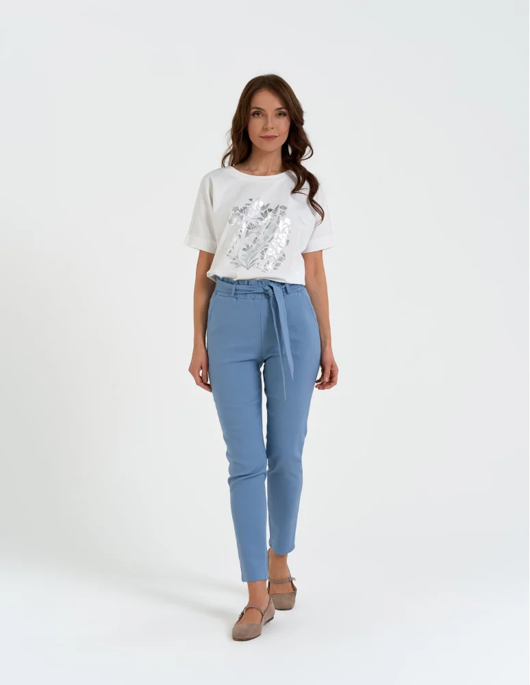 Spodnie damskie dopasowane z podwyższoną talią i wiązaniem NIEBIESKI
