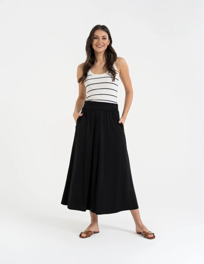 Elastyczna talia zwiększa wygodę użytkowania i pozwala na dobre dopasowanie bez uczucia ucisku. Długość maxi optycznie wydłuża sylwetkę, zachowując jednocześnie codzienny, swobodny charakter.
