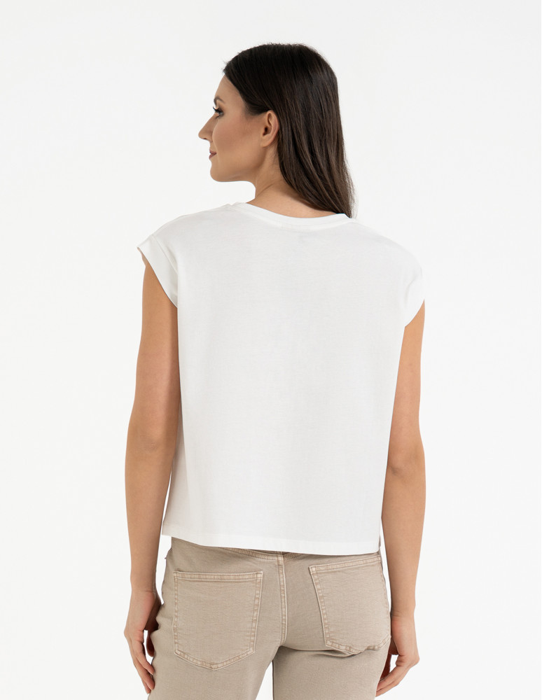 Ciekawy, nowoczesny kształt sprawia, że koszulka lekko opada na ramiona, tworząc swobodną, kobiecą linię. Subtelnie wydłużony rękaw nadaje jej lekkości i sprawia, że świetnie układa się na sylwetce. To fason, który doskonale wygląda zarówno w zestawieniu z szortami, jak i z ulubionymi jeansami.