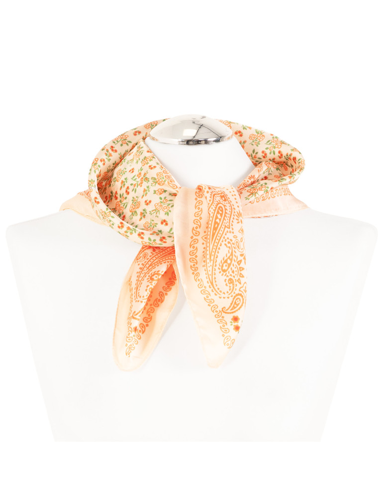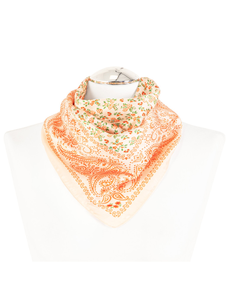 Ta damska apaszka to stylowy dodatek, który łączy klasyczną formę z dekoracyjnym wzornictwem. Wykonana z lekkiego, miękko układającego się materiału, zapewnia komfort noszenia i pozwala na łatwe modelowanie oraz wiązanie na różne sposoby. Kwadratowy format o wymiarach 68 × 68 cm sprawia, że apaszka doskonale sprawdzi się noszona na szyi, przewiązana przy torebce lub jako ozdobny akcent we włosach. Całość zdobi połączenie motywu paisley z drobnym wzorem florystycznym, uzupełnione subtelną ramką, która porządkuje kompozycję i nadaje całości spójny, estetyczny charakter. To uniwersalny dodatek do codziennych i bardziej dopracowanych stylizacji.