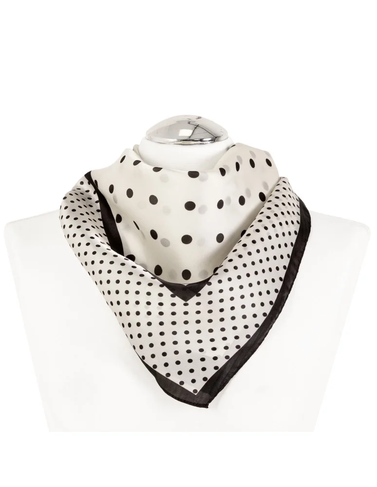 Ta damska apaszka to uniwersalny dodatek, który łączy ponadczasowy styl z funkcją praktyczną. Wykonana z lekkiego, przyjemnego w dotyku materiału, miękko układa się na szyi i pozwala na swobodne wiązanie na wiele sposobów. Klasyczny, kwadratowy format sprawia, że apaszka dobrze prezentuje się zarówno noszona na szyi, jak i jako stylowy akcent przy torebce lub we włosach. Całość zdobi kontrastowy wzór w grochy, zestawiony z jednolitą ramką, która porządkuje kompozycję i nadaje jej wyrazistego, eleganckiego charakteru. To ponadczasowy dodatek do codziennych i bardziej dopracowanych stylizacji.
