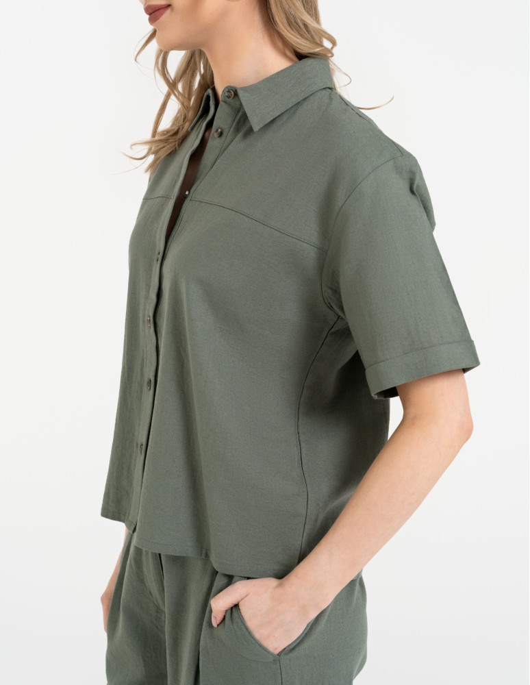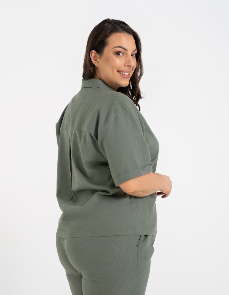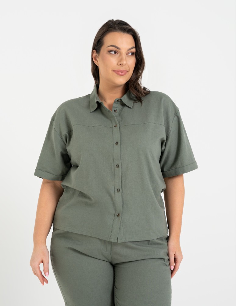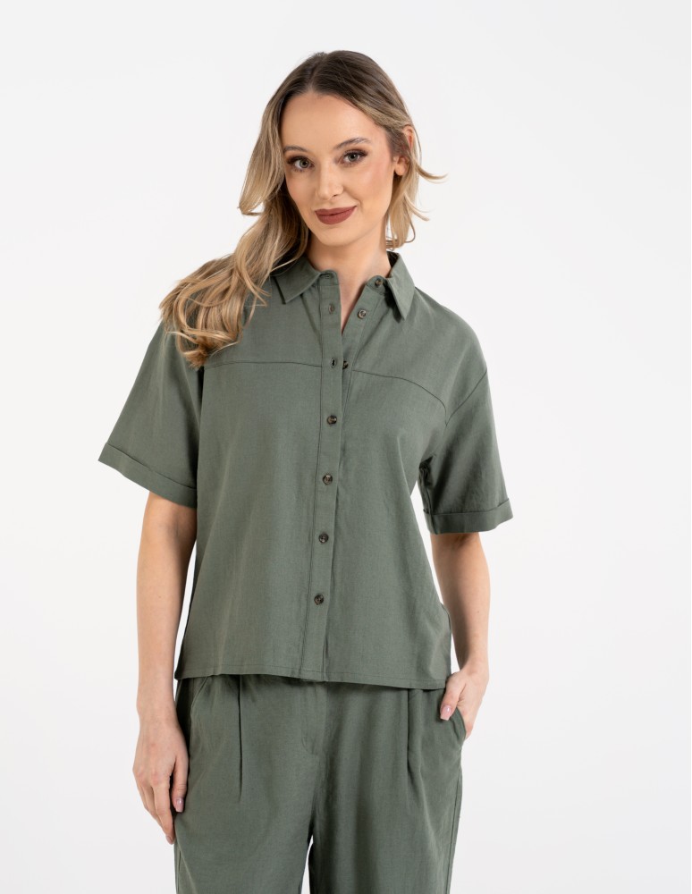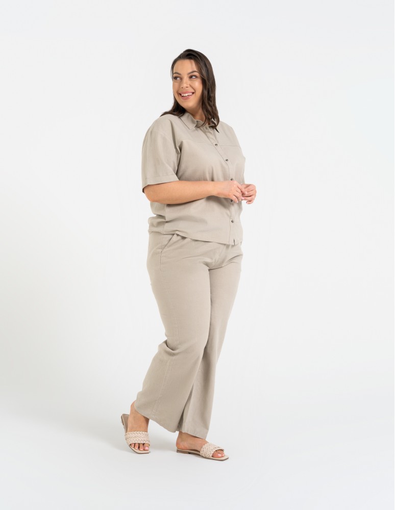 Koszula damska casual elegancka z lnu i wiskozy i krótkim rękawem BEŻOWY