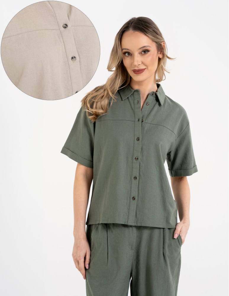 Koszula damska casual elegancka z lnu i wiskozy i krótkim rękawem BEŻOWY