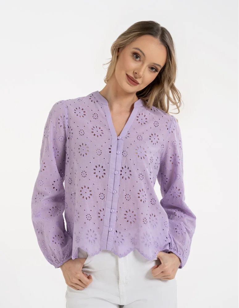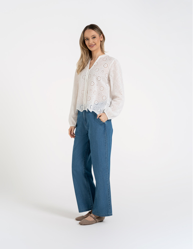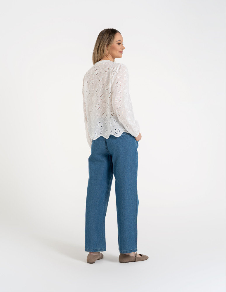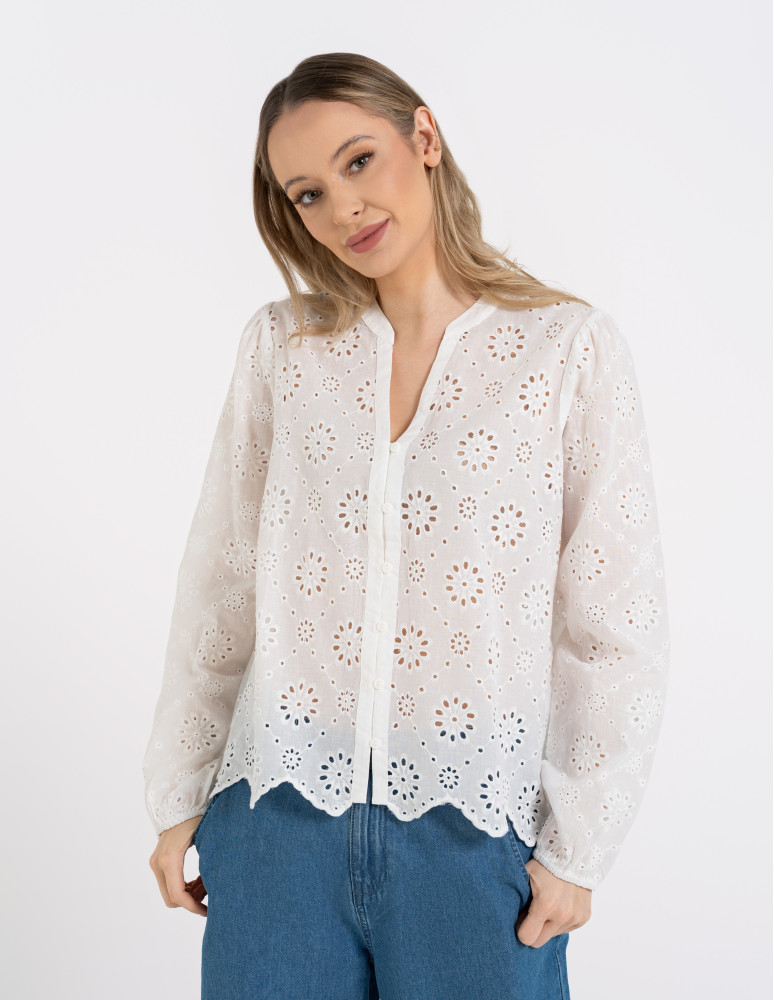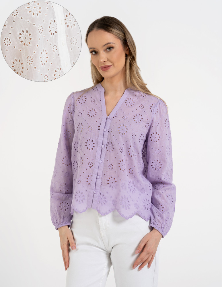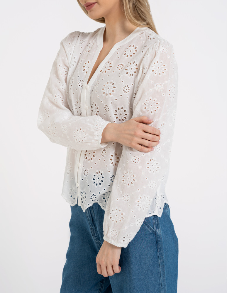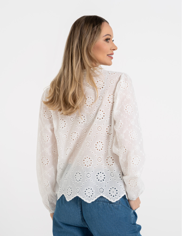 Model posiada klasyczne zapięcie na guziki oraz dekolt w kształcie delikatnej litery V, optycznie wysmuklający sylwetkę. Długie rękawy zakończone lekką gumką zapewniają komfort noszenia i subtelne marszczenie. Uwagę przyciąga dekoracyjnie wykończony dół z falowanym brzegiem i ażurowym haftem, który dodaje lekkości i wyjątkowego stylu.