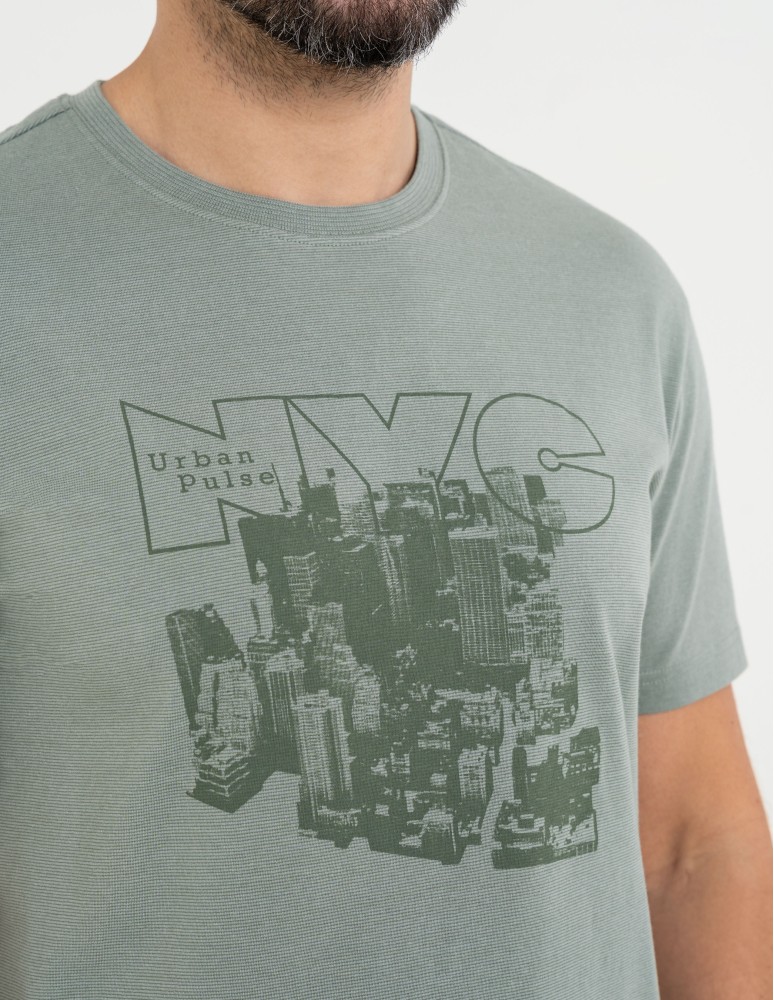 Męski T-shirt Moraj o kroju regular to klasyczna baza w nowoczesnym wydaniu. Model wykonany z dzianiny o subtelnym wzorze mikropasków, który nadaje całości delikatnej struktury i głębi. Monochromatyczny, lekki nadruk na przodzie podkreśla miejski charakter koszulki, zachowując stonowany i uniwersalny styl.
