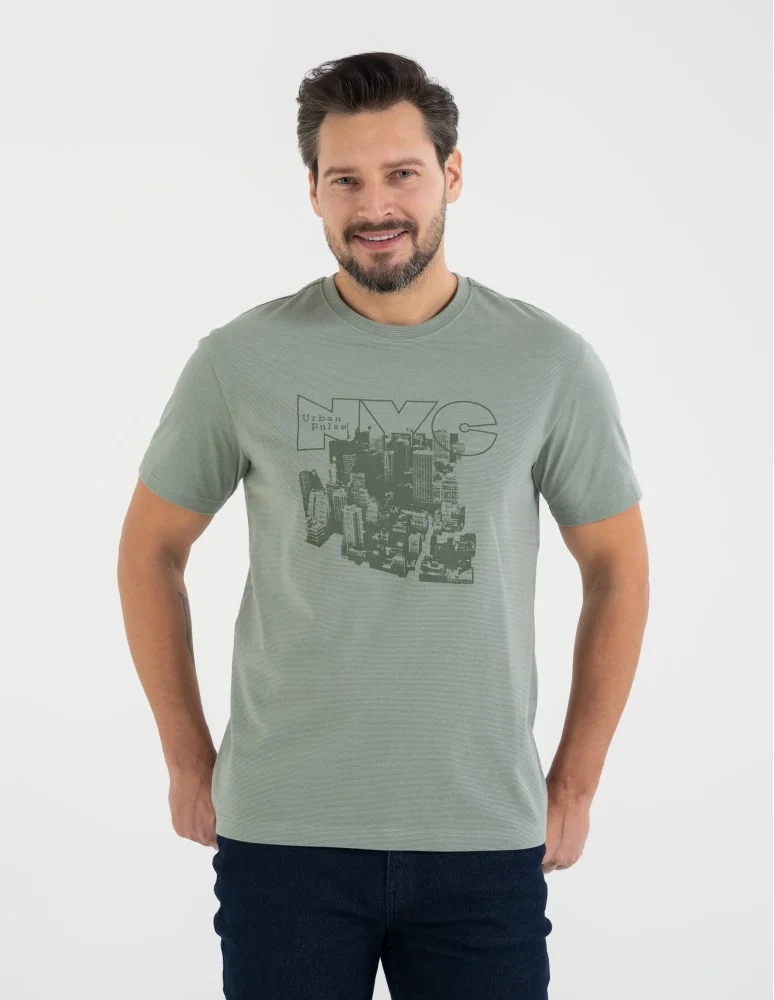 Męski T-shirt Moraj o kroju regular to klasyczna baza w nowoczesnym wydaniu. Model wykonany z dzianiny o subtelnym wzorze mikropasków, który nadaje całości delikatnej struktury i głębi. Monochromatyczny, lekki nadruk na przodzie podkreśla miejski charakter koszulki, zachowując stonowany i uniwersalny styl.