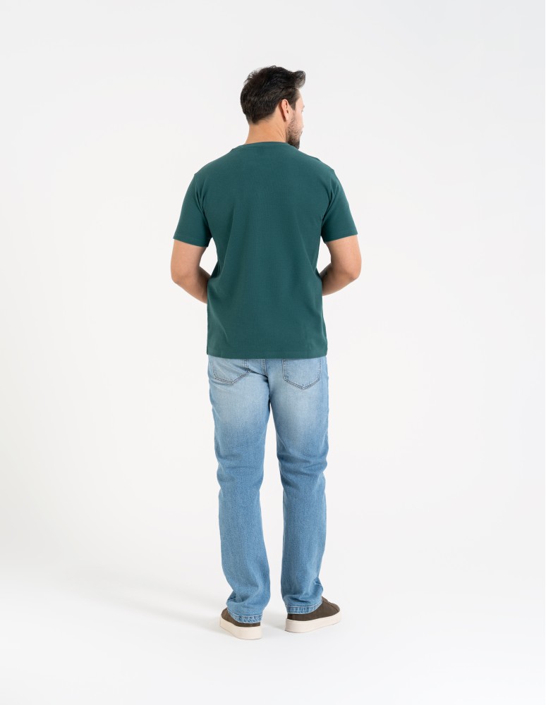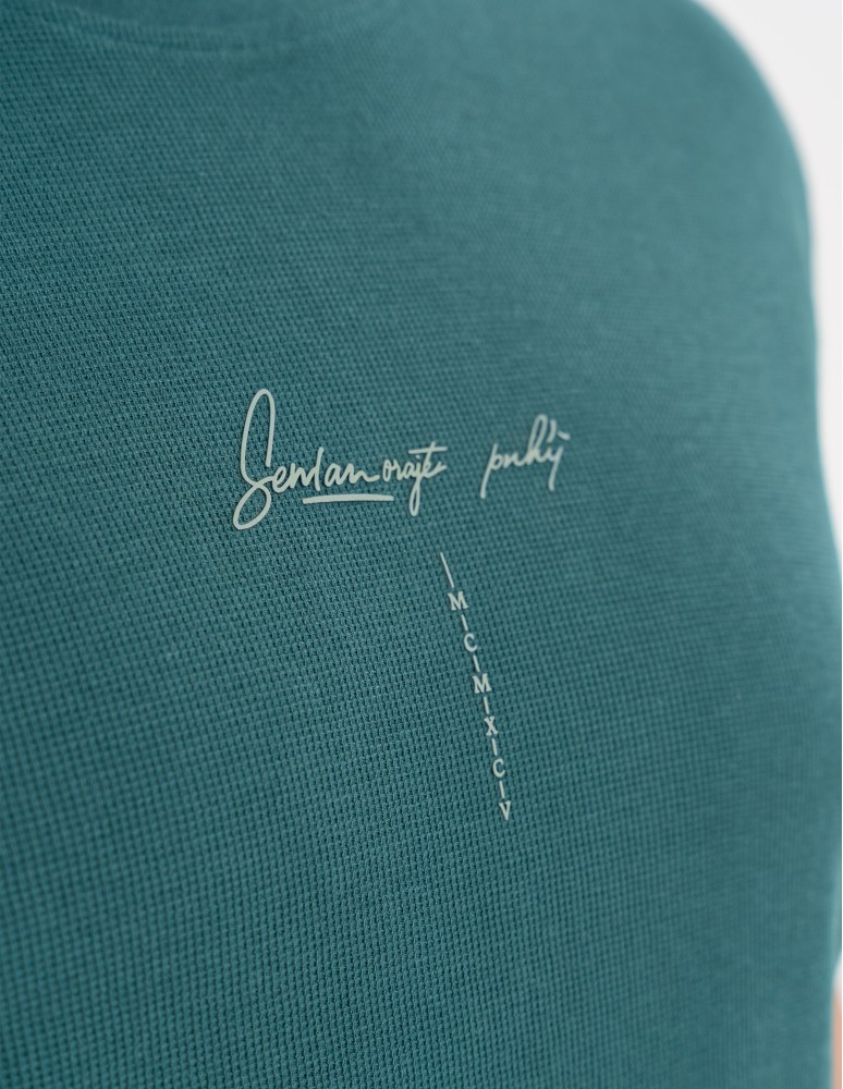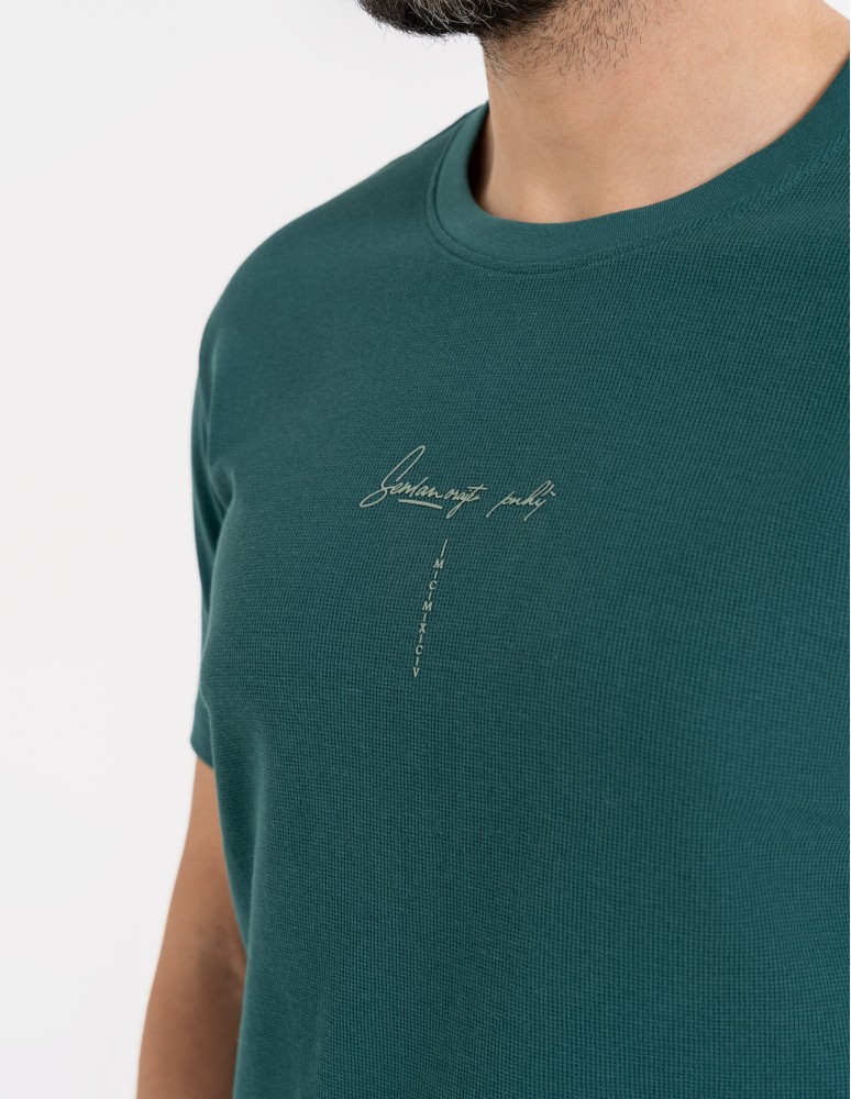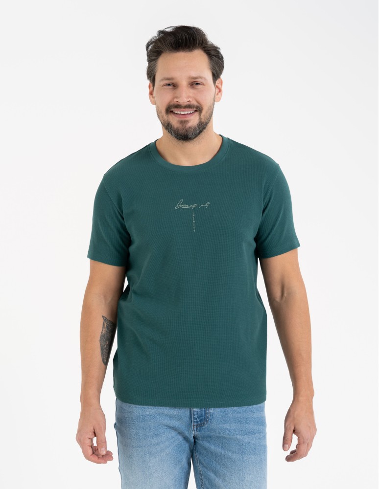Koszulka ma krój regular, który zapewnia swobodę ruchów i uniwersalne dopasowanie do sylwetki. Fakturowana dzianina nadaje jej subtelnej struktury i wyróżnia ją na tle gładkich modeli. Minimalistyczny, mały print na piersi stanowi delikatny akcent, który podkreśla nowoczesny, miejski charakter koszulki bez przesadnej dominacji.