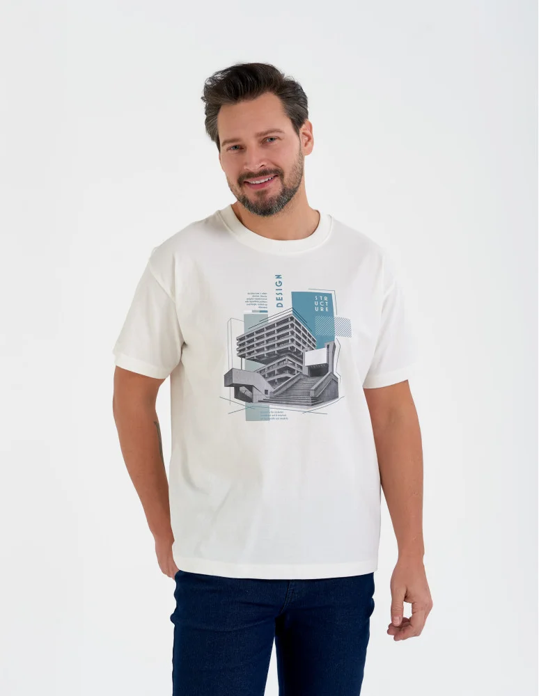 Ten męski T-shirt oversize to połączenie swobodnego kroju z nowoczesnym, graficznym nadrukiem inspirowanym architekturą. Wykonany z wysokiej jakości dzianiny bawełnianej o wyczuwalnie miękkim wykończeniu typu peach touch, zapewnia komfort noszenia przez cały dzień. Luźny fason nie krępuje ruchów i dobrze układa się na sylwetce, sprawdzając się zarówno w codziennych stylizacjach, jak i w bardziej miejskim, nowoczesnym wydaniu. Wyrazisty nadruk na przodzie nadaje koszulce charakteru i podkreśla jej współczesny styl.