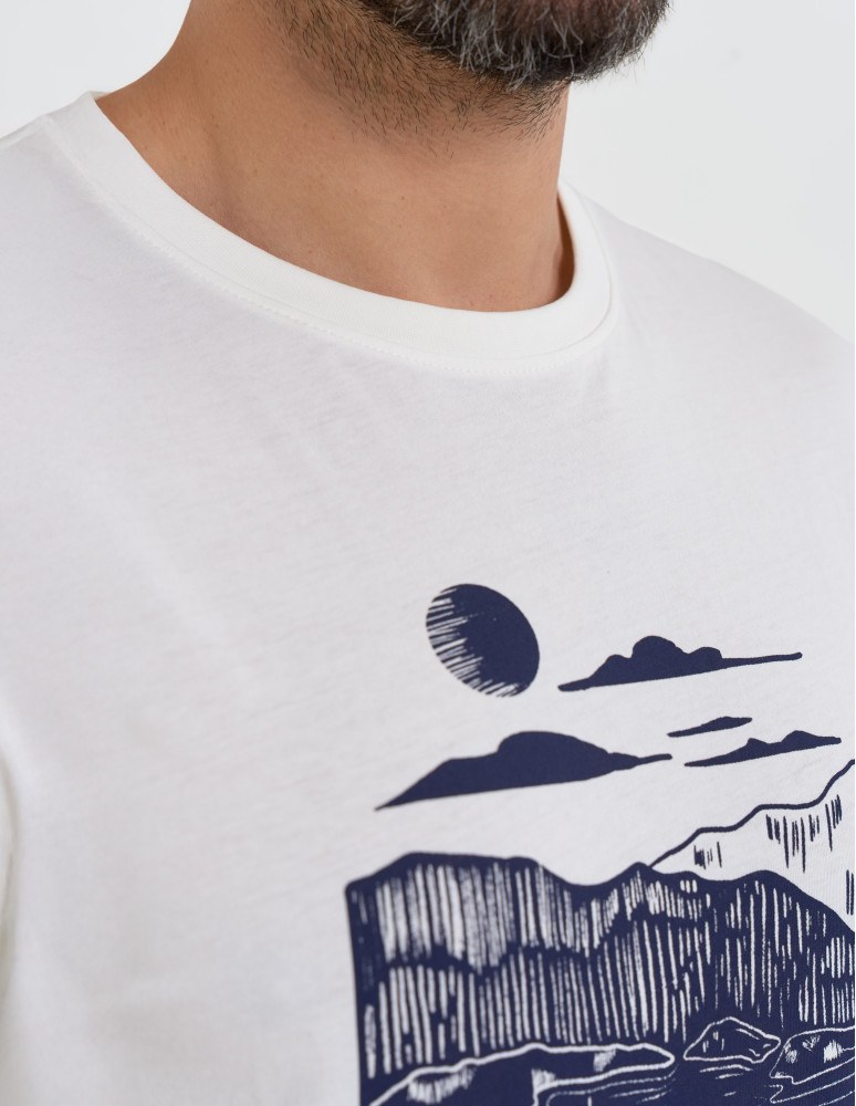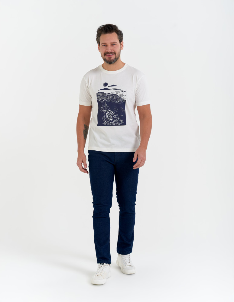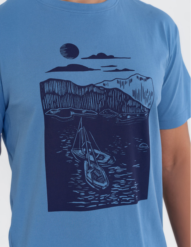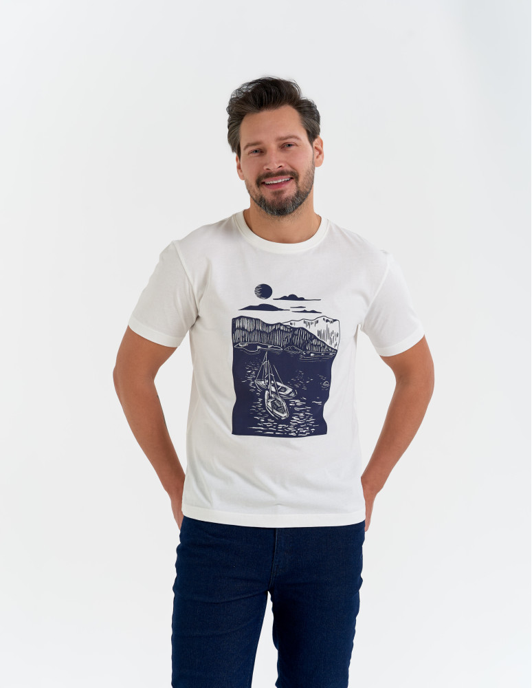 Męska koszulka z krótkim rękawem wykonana w 100% z miękkiej, oddychającej bawełny, która zapewnia wygodę noszenia przez cały dzień. Na przodzie znajduje się artystyczny nadruk z motywem żeglarskim, dodający całości wyjątkowego, wakacyjnego charakteru.