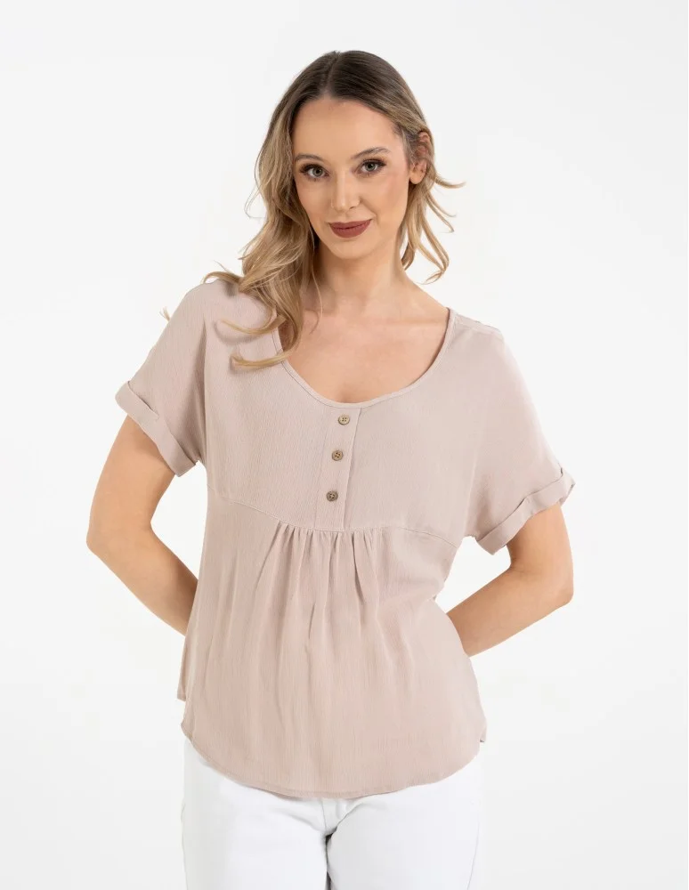 Bluzka damska z wiskozy z guzikami przy dekolcie BEŻOWY
