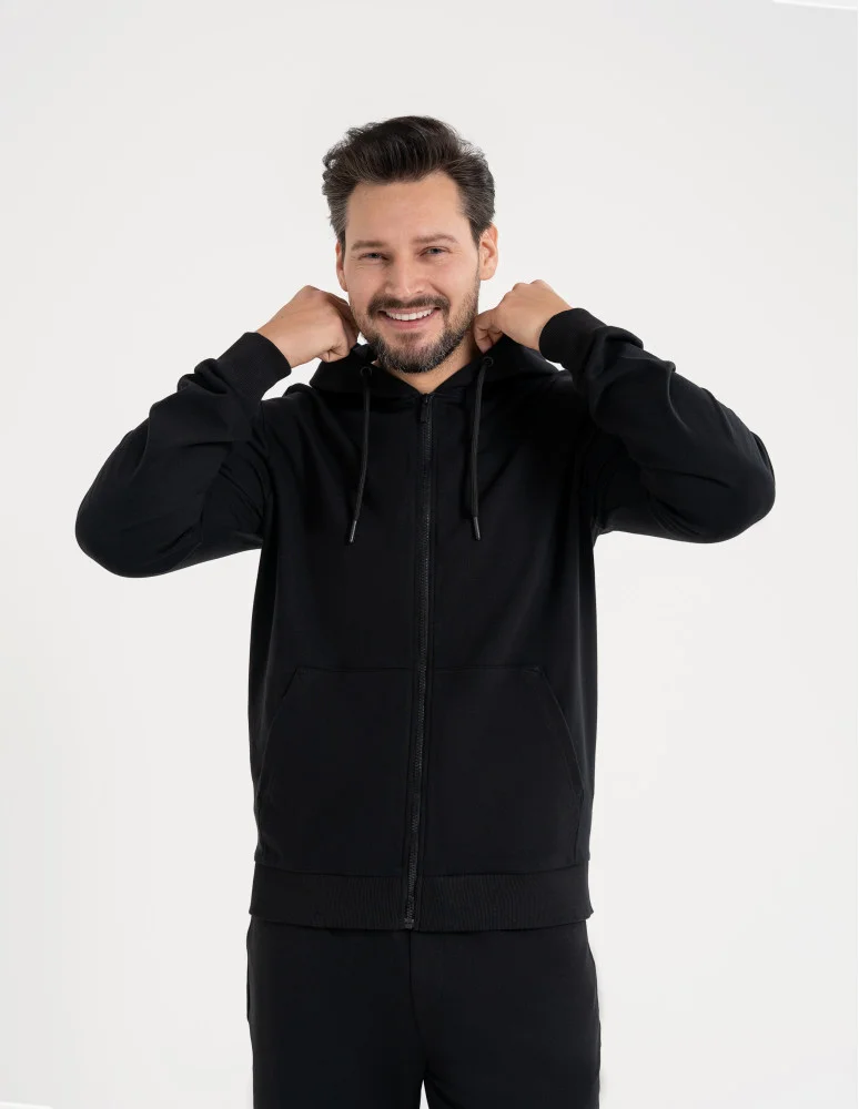 Męska bluza rozpinana zaprojektowana z myślą o codziennym komforcie i uniwersalnym stylu. Klasyczny fason sprawia, że bluza dobrze układa się na sylwetce i nie krępuje ruchów, dzięki czemu sprawdzi się zarówno w domu, jak i w codziennych stylizacjach miejskich. Zapięcie na zamek pozwala na łatwe zakładanie i regulację, a kaptur z troczkami zwiększa funkcjonalność w chłodniejsze dni. Praktyczne kieszenie po bokach dodają wygody w użytkowaniu. To podstawowy element garderoby dla mężczyzn, którzy stawiają na wygodę i prostotę.