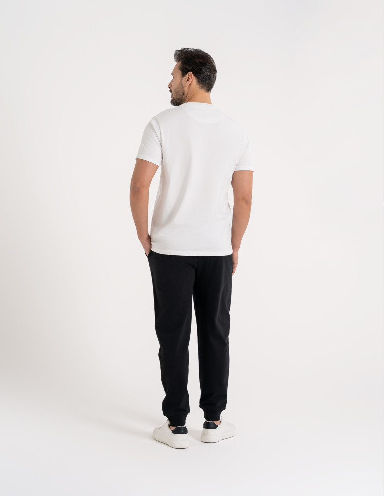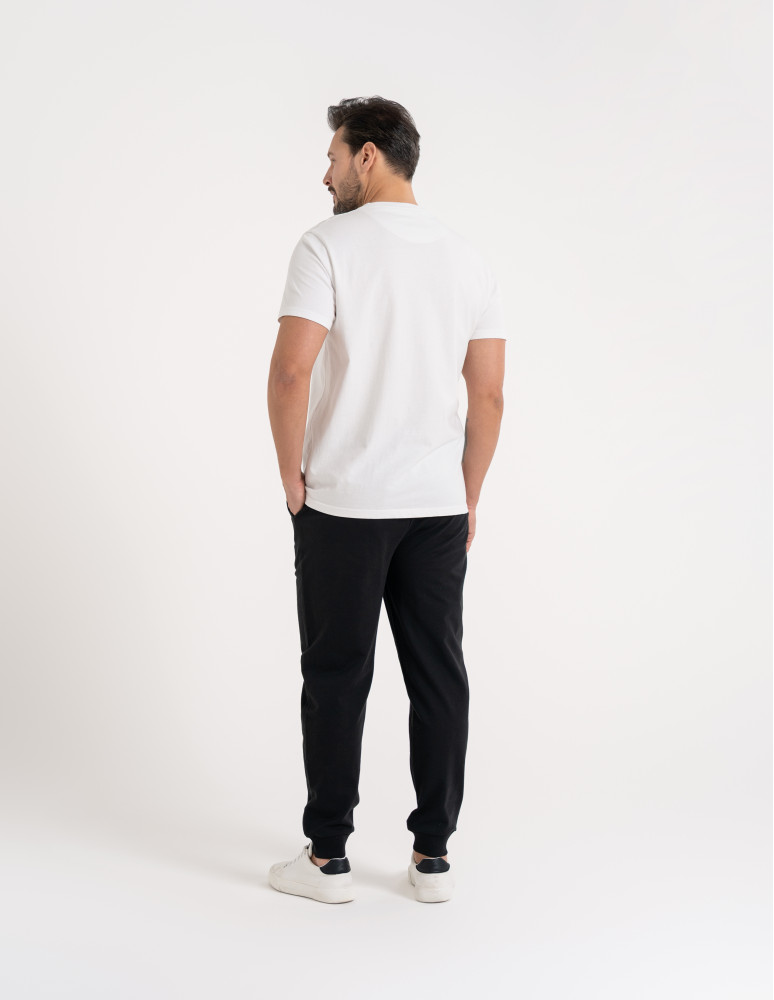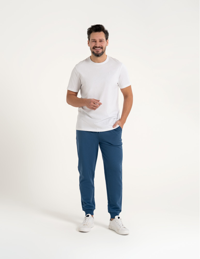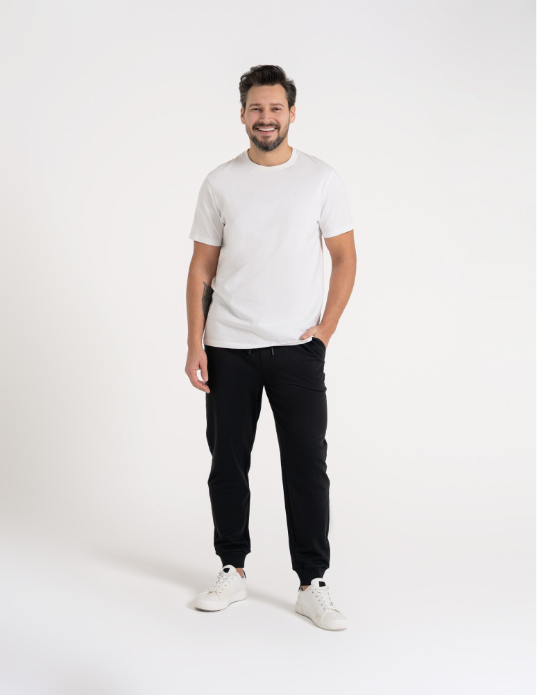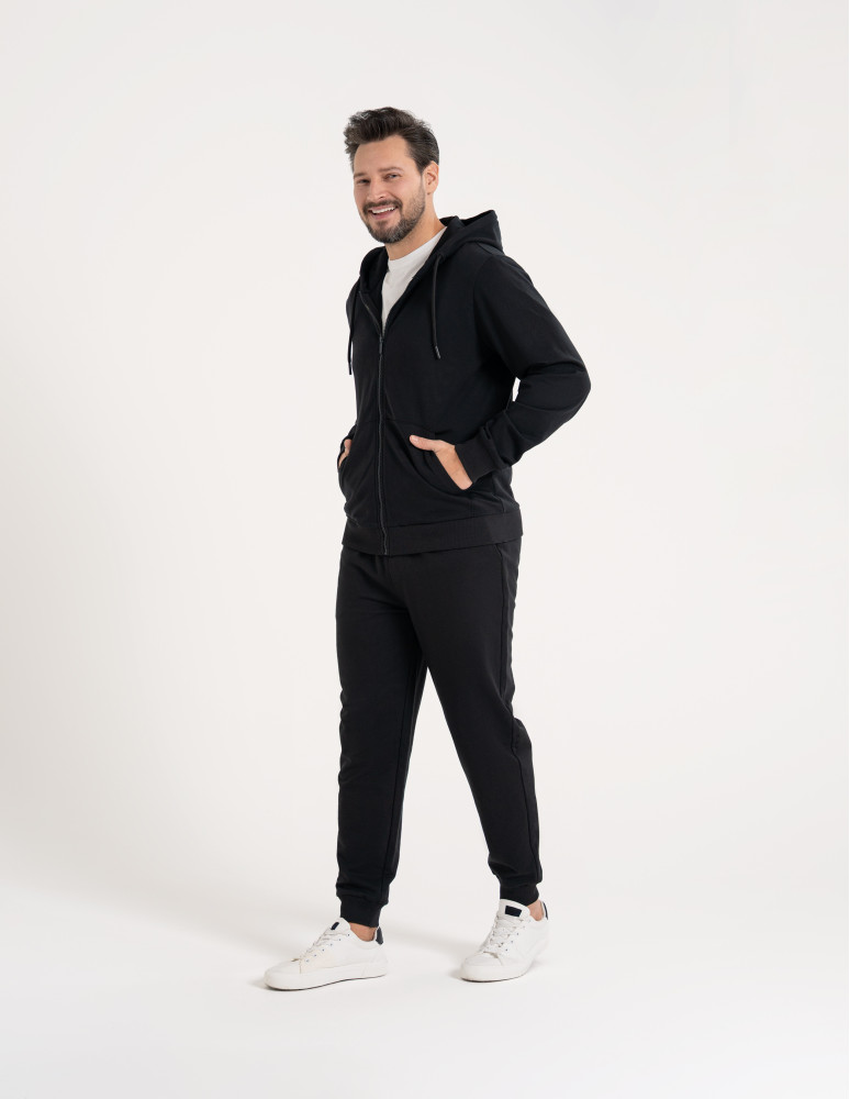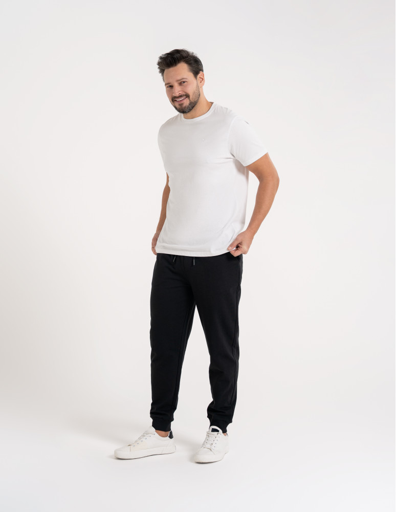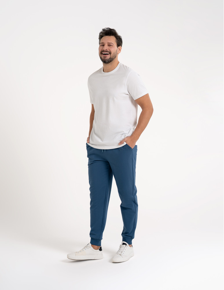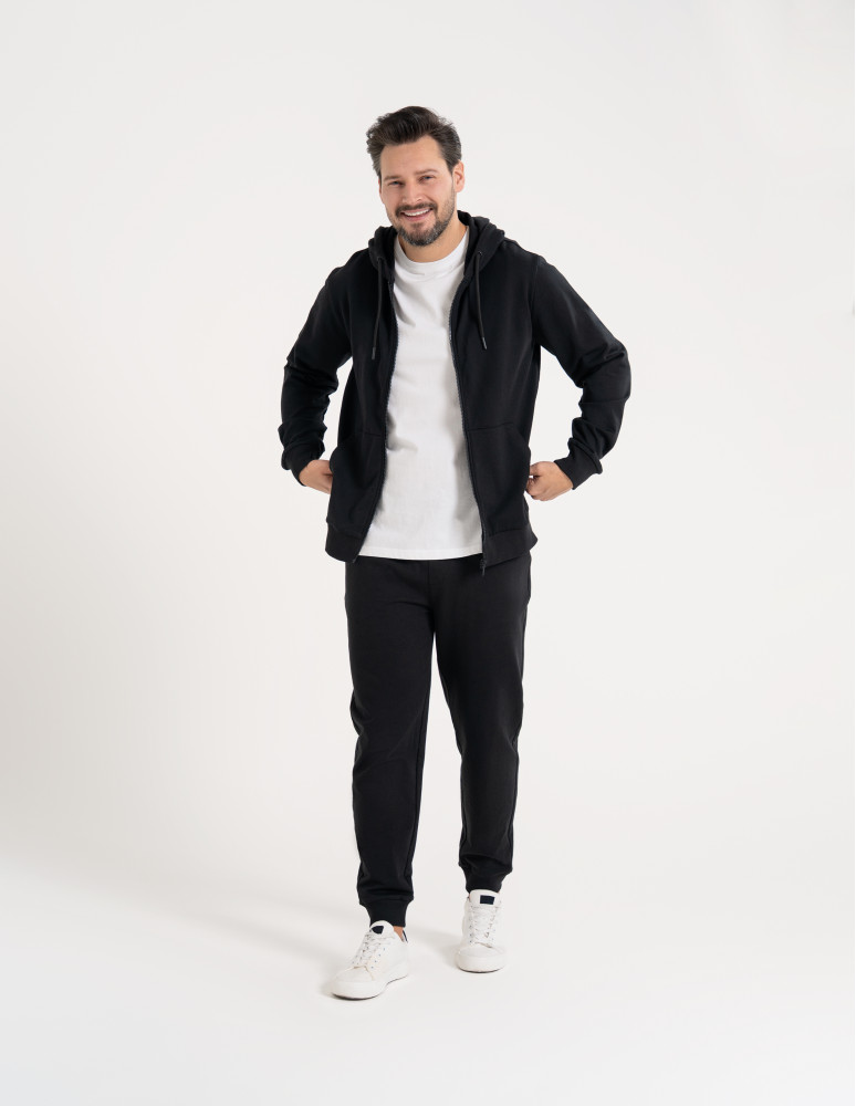 Te męskie spodnie dresowe zostały zaprojektowane z myślą o codziennym komforcie i swobodzie ruchu. Wykonane z miękkiego, przyjemnego w dotyku materiału, dobrze układają się na sylwetce i sprawdzają się zarówno w domowym użytkowaniu, jak i w casualowych stylizacjach na co dzień. Elastyczny pas z regulacją na troczki pozwala na indywidualne dopasowanie, a zwężane nogawki zakończone ściągaczami nadają całości nowoczesny, uporządkowany wygląd. To praktyczny wybór dla mężczyzn ceniących wygodę bez rezygnacji z estetyki.