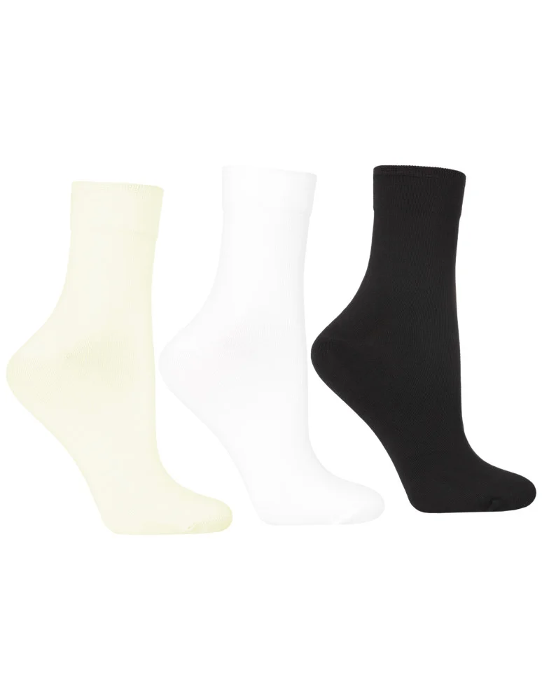 Zestaw trzech par damskich skarpetek wykonanych z miękkiej bawełny z dodatkiem elastycznych włókien. Klasyczny, gładki design sprawia, że pasują do wielu codziennych stylizacji. Dzięki nieuciskającemu ściągaczowi gwarantują wygodę noszenia przez cały dzień, nie pozostawiając śladów na skórze. Skarpetki są oddychające, przyjemne w dotyku i elastyczne, co zapewnia komfort oraz idealne dopasowanie do stopy.