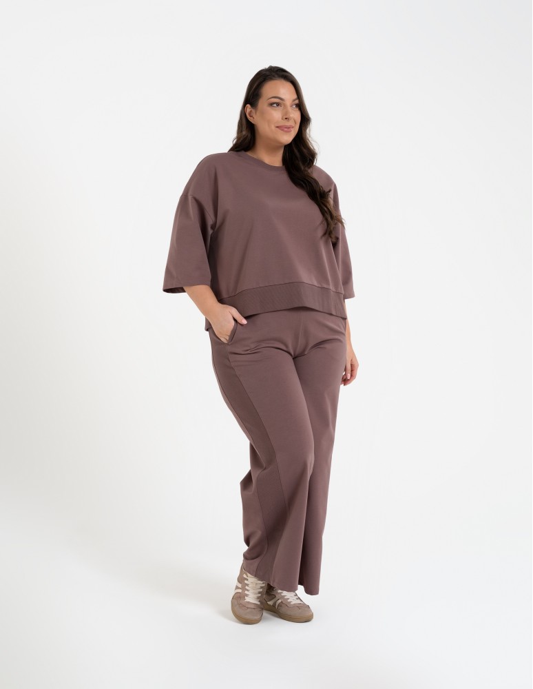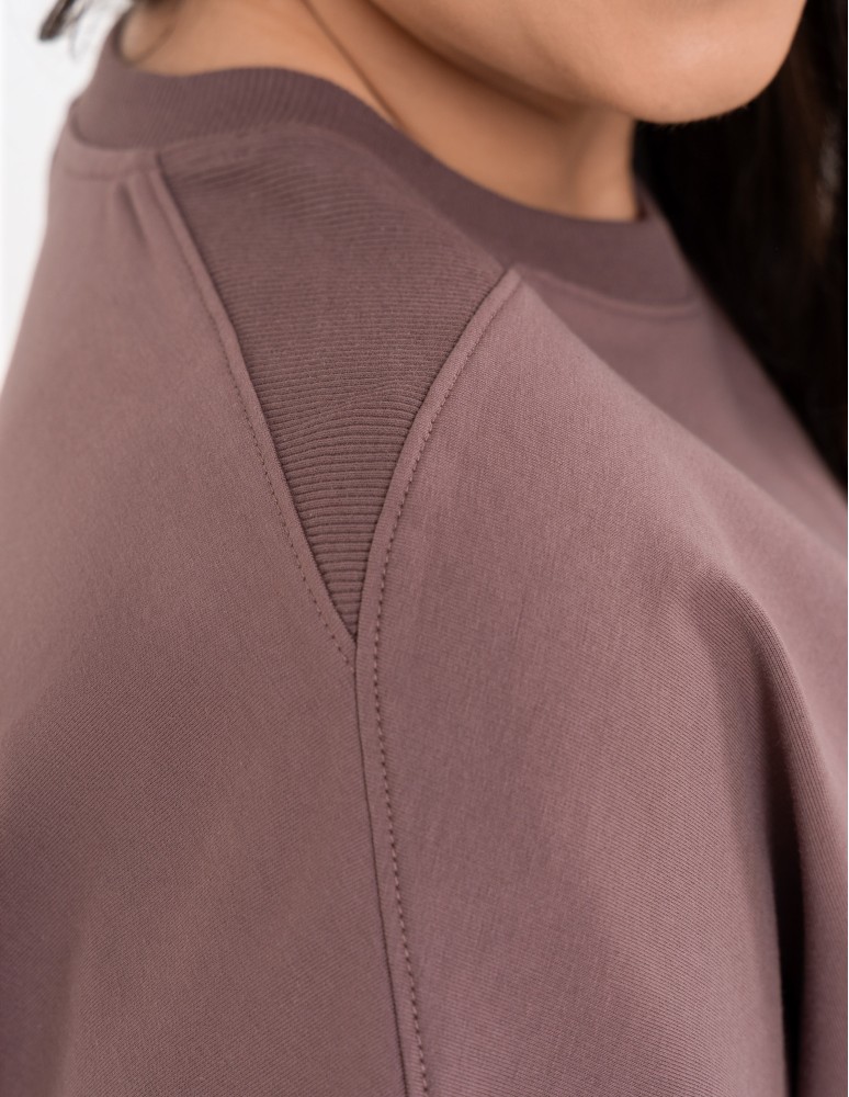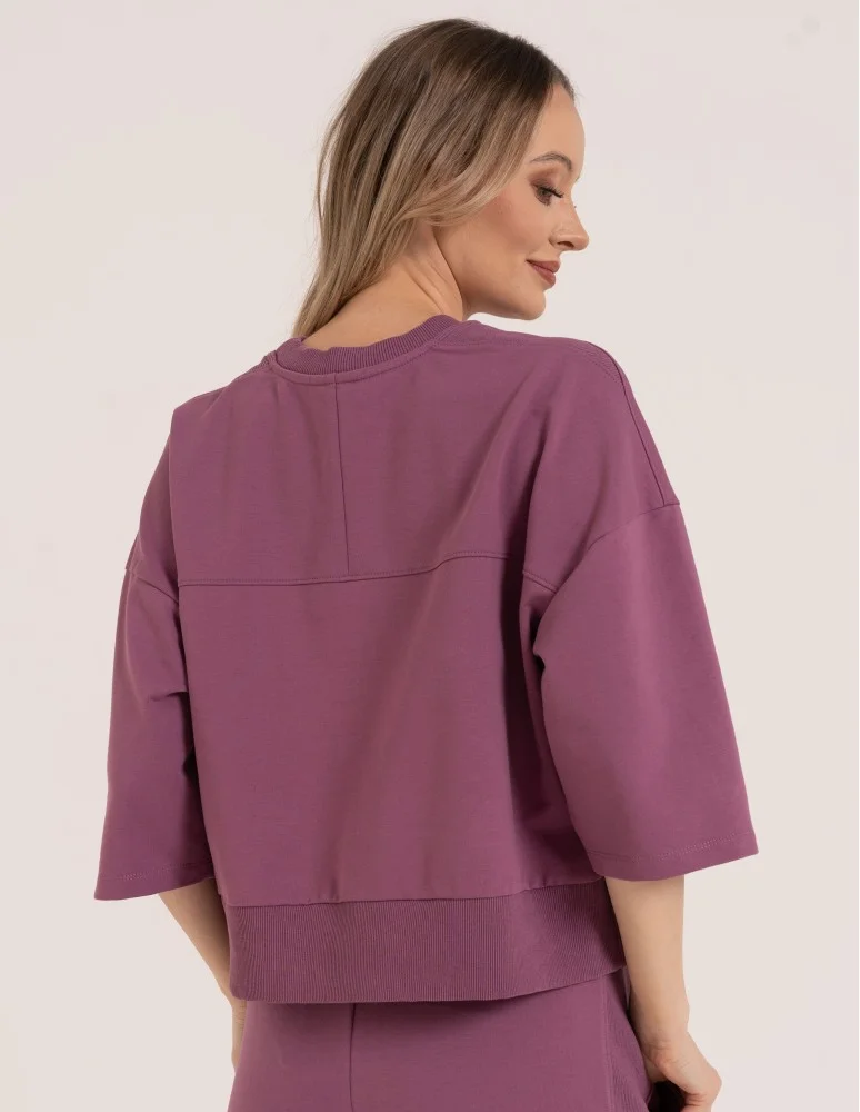 Luźniejszy krój z obniżoną linią ramion oraz rękawy o długości 3/4 nadają jej swobodnego, modnego charakteru. Szeroki prążkowany dół subtelnie podkreśla sylwetkę i sprawia, że bluza świetnie układa się zarówno w zestawie ze spodniami dresowymi, jak i jeansami czy legginsami. To model, który jest łatwy do wystylizowania wystarczy dodać ulubione sneakersy i gotowe.