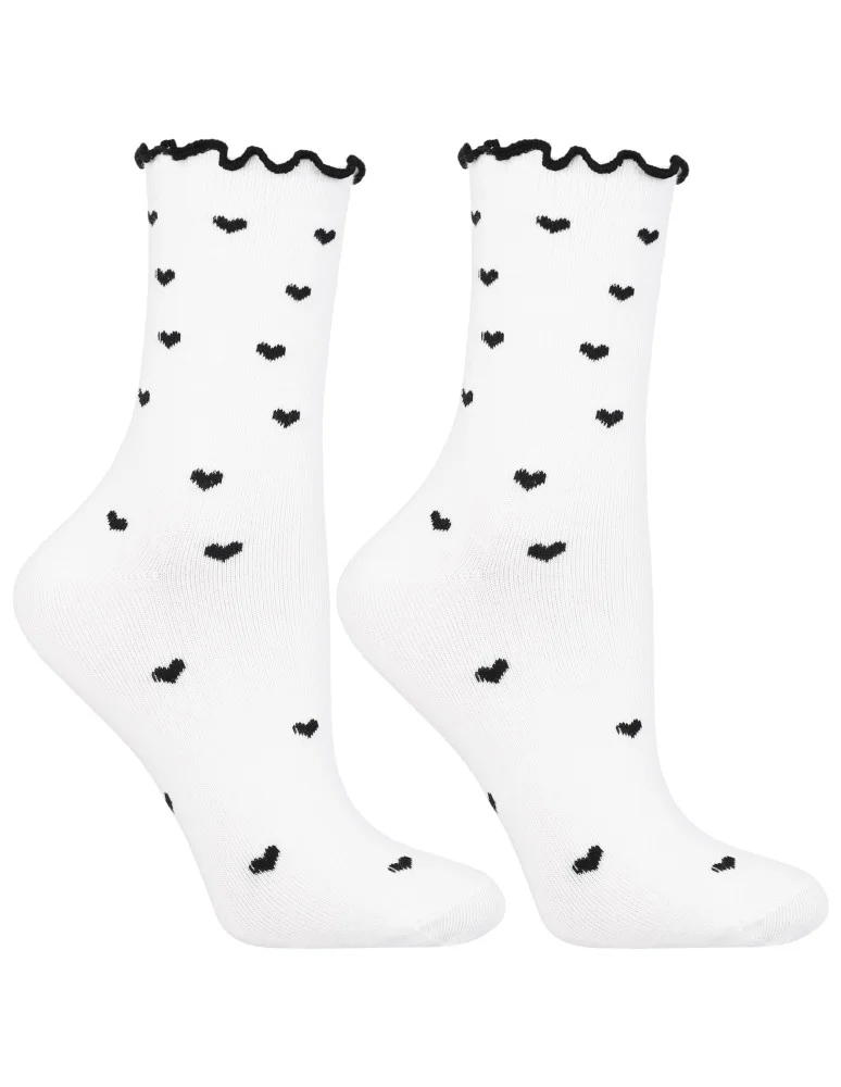 Zestaw trzech par uroczych damskich skarpetek wykonanych z miękkiej bawełny z domieszką elastycznych włókien, które zapewniają komfort noszenia przez cały dzień. Biały materiał zdobi czarny wzór w serduszka, a górę skarpetki falbanka w kontrastującym kolorze, dodająca dziewczęcego uroku. Idealne do codziennych stylizacji, pasują zarówno do sneakersów, jak i półbutów.