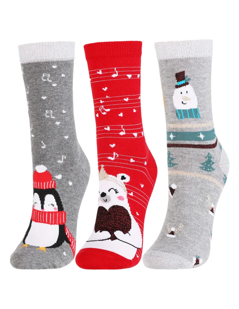 Zanurz się w magiczny klimat z zestawem trzech wyjątkowych par skarpet damskich, które łączą w sobie wygodę, ciepło i bajeczny, zimowy wzór. Każda para w zestawie zachwyca innym, zimowym motywem – uroczy pingwinek w szaliku, miś polarny z brokatowym sercem oraz bałwanek i renifer w zimowej scenerii. Te skarpetki to nie tylko ciepły dodatek, ale też stylowy akcent na chłodniejsze dni. Idealne na prezent lub jako sposób na wprowadzenie świątecznej atmosfery do codziennych stylizacji.