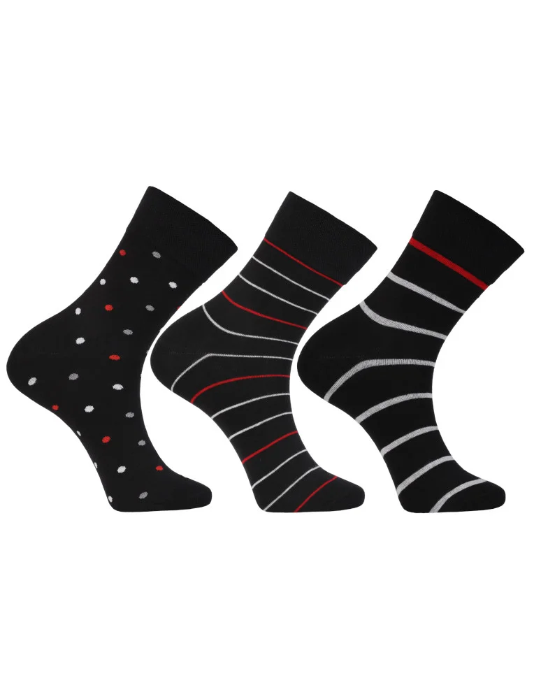 Wygodne męskie skarpety garniturowe w klasycznych wzorach – kropki, cienkie i szerokie paski – idealne do codziennego użytku, jak i do eleganckich stylizacji. Wykonane z miękkiej bawełny z domieszką elastycznych włókien, zapewniają komfort noszenia przez cały dzień. Długi fason chroni przed zimnem i dobrze trzyma się na nodze. Subtelna kolorystyka w odcieniach czerni, bieli i czerwieni sprawia, że skarpety łatwo dopasujesz do każdego stroju.