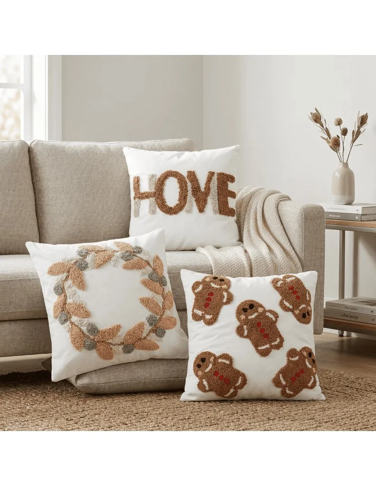 Wprowadź do swojego wnętrza ciepły, klimat dzięki zestawowi trzech poszewek dekoracyjnych z haftem 3D. Każda z nich ma unikalny wzór – urocze pierniczki, napis HOME oraz wieniec z liści – tworząc razem spójną i przytulną kompozycję idealną na zimowe dni.