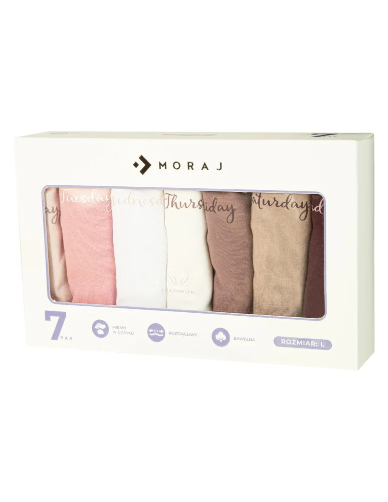 Zestaw 7 par majtek damskich typu bikini to praktyczne i wygodne rozwiązanie na każdy dzień tygodnia. Każda para ozdobiona jest subtelnym napisem z nazwą dnia, co nadaje kompletowi lekkości i kobiecego charakteru. To bielizna, która łączy funkcjonalność z estetycznym detalem.