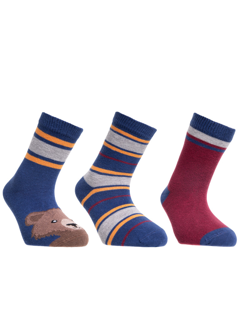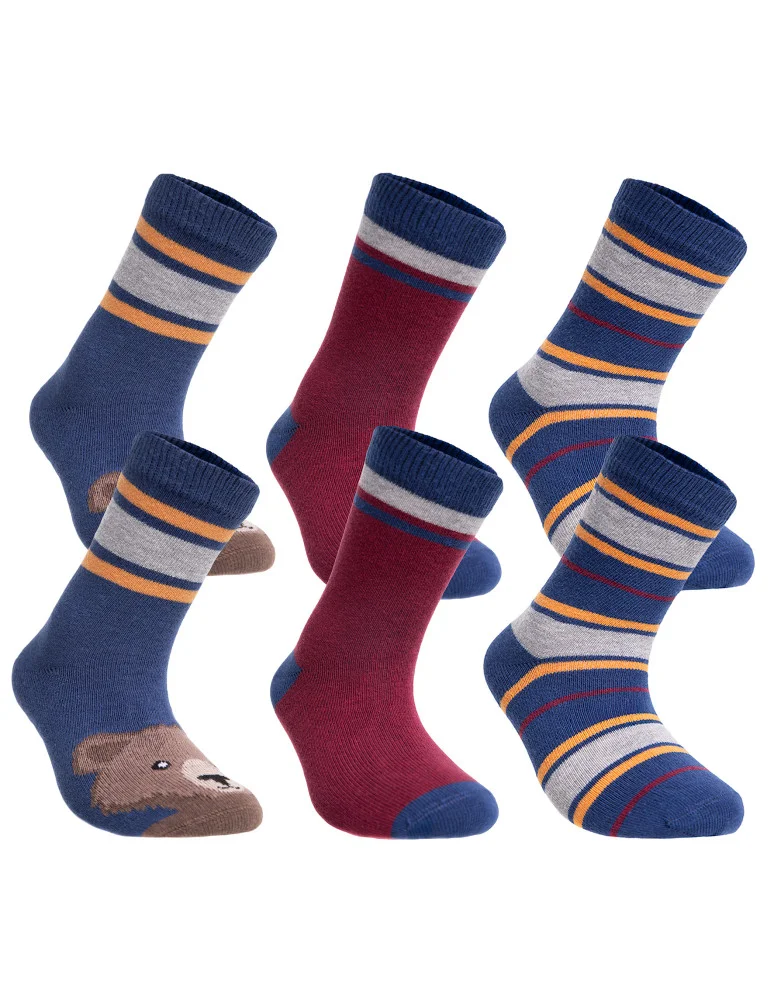 Wygodne, długie skarpetki chłopięce w praktycznym 6-paku. W zestawie różnorodne wzory i kolory – od klasycznych pasków po urocze misie. Wykonane z miękkiego, przyjemnego w dotyku materiału, który zapewnia komfort noszenia przez cały dzień. Elastyczny ściągacz utrzymuje skarpetkę na miejscu, nie uciskając nogi. Doskonałe na co dzień, do przedszkola, szkoły czy zabawy.