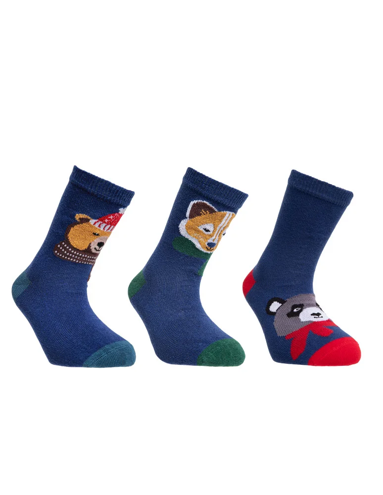 Kolorowy zestaw 3 par długich skarpetek chłopięcych z uroczymi motywami zwierzątek to idealna propozycja na zimowe dni! Skarpetki zdobią wesołe wzory: miś w czapce, lis w szaliku oraz szop w czerwonym szaliku – każdy model to radość z noszenia i zabawy.