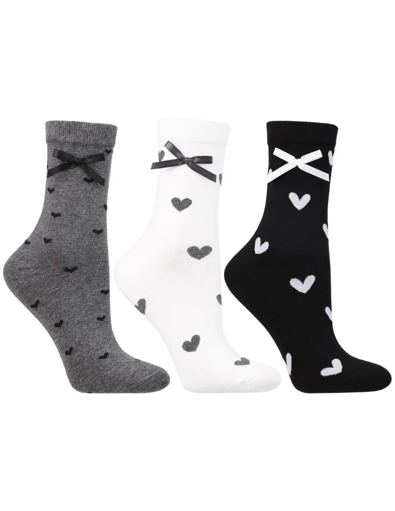 Zestaw trzech par długich skarpetek damskich, które łączą w sobie wygodę, styl i subtelną kobiecość. Każda para wyróżnia się uroczym wzorem serduszek oraz delikatną kokardką umieszczoną przy ściągaczu, co dodaje całości romantycznego i dziewczęcego charakteru. W komplecie znajdują się skarpetki w trzech wariantach kolorystycznych: klasyczna czerń, biel i uniwersalna szarość.