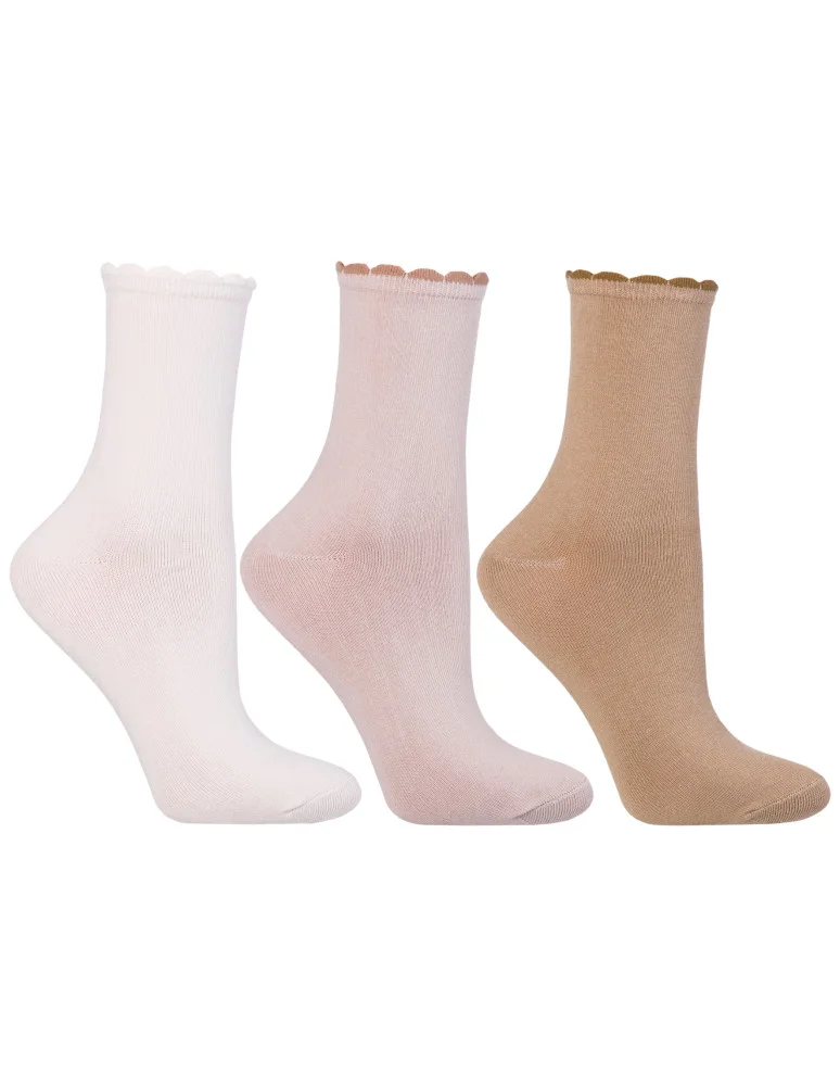 Komfort i styl basic z naszymi miękkimi skarpetkami bawełnianymi damskimi. Zestaw zawiera trzy pary długich skarpet w neutralnych odcieniach: złamanej bieli, brązu i beżowym. Wykonane z wysokiej jakości mieszanki bawełny z dodatkiem elastcyznych włókien, zapewniają wyjątkową miękkość i oddychalność przez cały dzień. Delikatna falbanka na górze dodaje subtelnego uroku, a jednolite kolory sprawiają, że skarpetki łatwo dopasować do każdej stylizacji. Idealne na co dzień, stanowią basicową podstawę w każdej garderobie, łącząc komfort z modnym wyglądem.