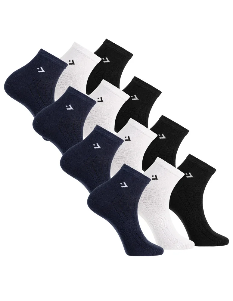 Skarpety męskie Basic idealne na co dzień. Wykonane z wysokiej jakości bawełny z domieszką elastanu, zapewniają komfort i trwałość przez cały dzień. Charakteryzują się klasycznym ściągaczem, który utrzymuje je na miejscu bez uciskania. Dzięki praktycznemu 12-pakowi, skarpety będą doskonałym wyborem do codziennego użytku, zarówno do pracy, jak i na co dzień. Wysokość skarpety za kostkę sprawia, że są one uniwersalne i pasują do większości butów. Dostępne w klasycznych kolorach bieli, czerni i granatu, pasujących do każdej garderoby.