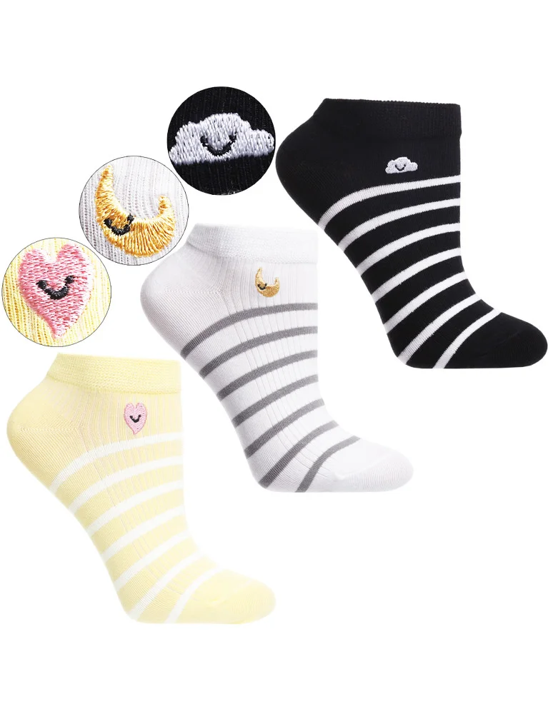 Skarpety stopki damskie w paski z haftem 3-pak WIELOKOLOROWY
