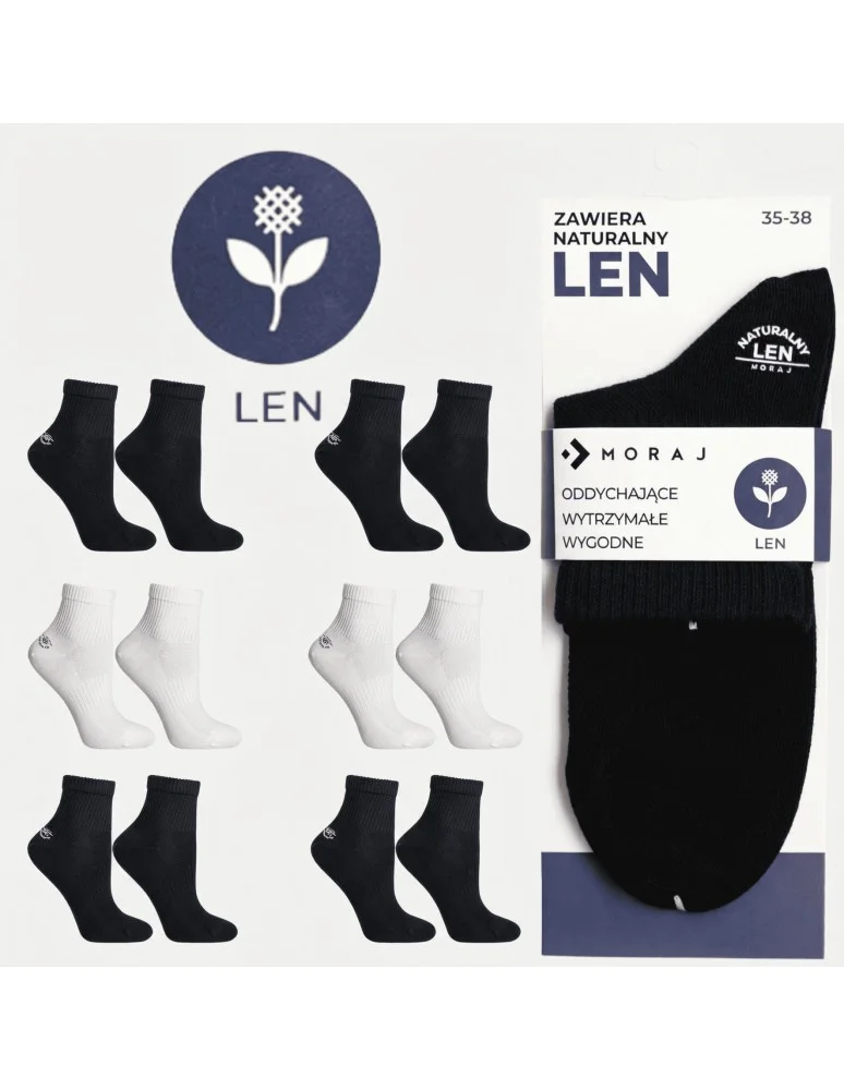 Damskie skarpetki w zestawie 6 par to połączenie naturalnych włókien i codziennego komfortu. W składzie znajduje się len – materiał ceniony za swoje wyjątkowe właściwości, który w połączeniu z innymi włóknami tworzy trwałą i funkcjonalną dzianinę na każdą porę roku.