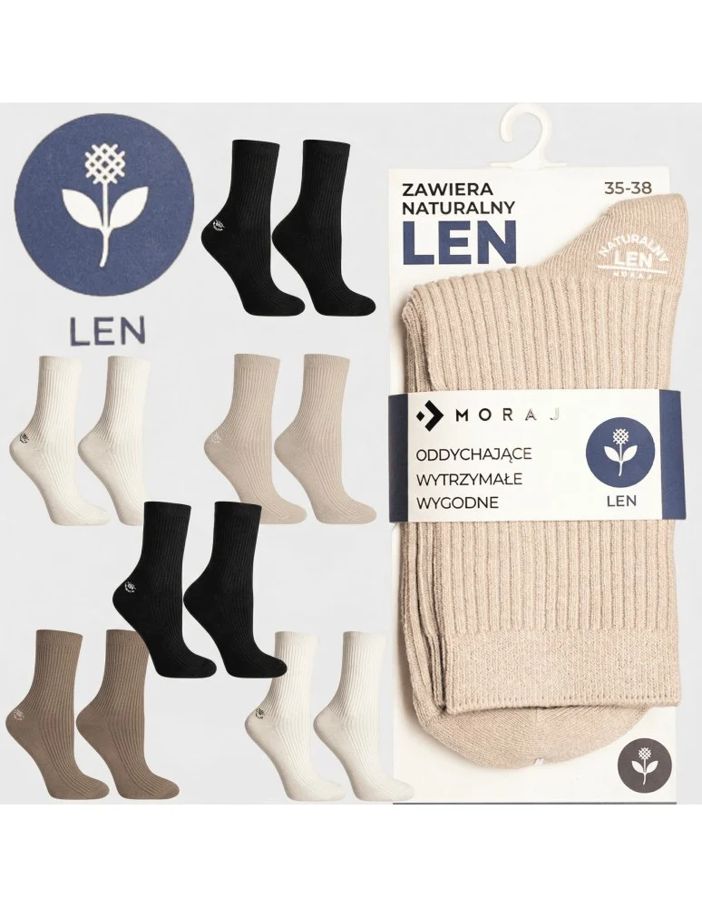 Damskie skarpetki w zestawie 6 par to połączenie naturalnych włókien i codziennego komfortu. W składzie znajduje się len – materiał ceniony za swoje wyjątkowe właściwości, który w połączeniu z innymi włóknami tworzy trwałą i funkcjonalną dzianinę na każdą porę roku.
