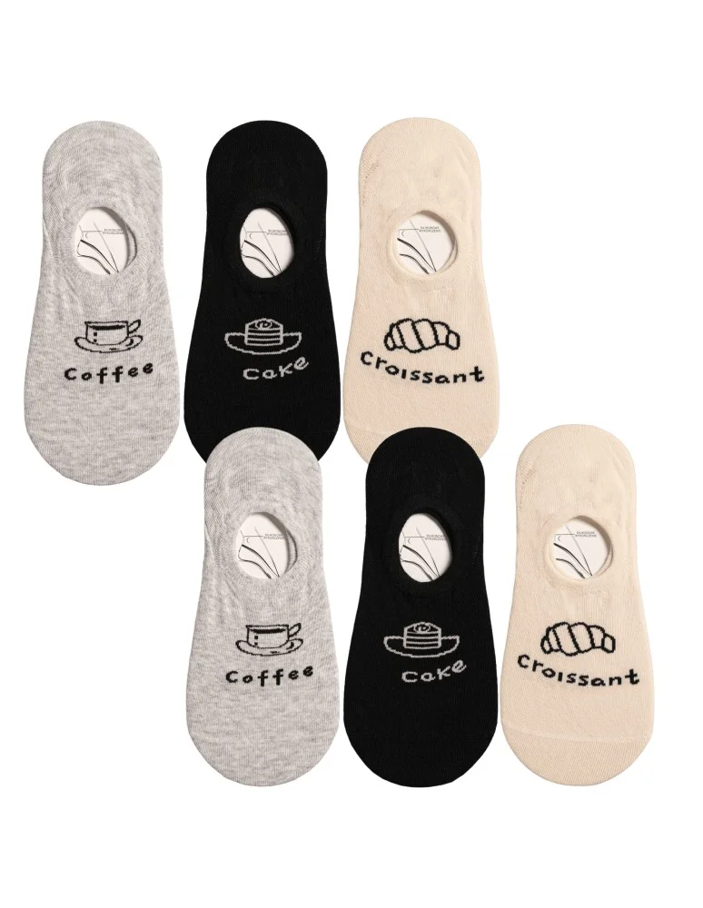 Każda para ma minimalistyczny nadruk inspirowany codziennymi przyjemnościami – filiżanka kawy, kawałek ciasta oraz croissant.