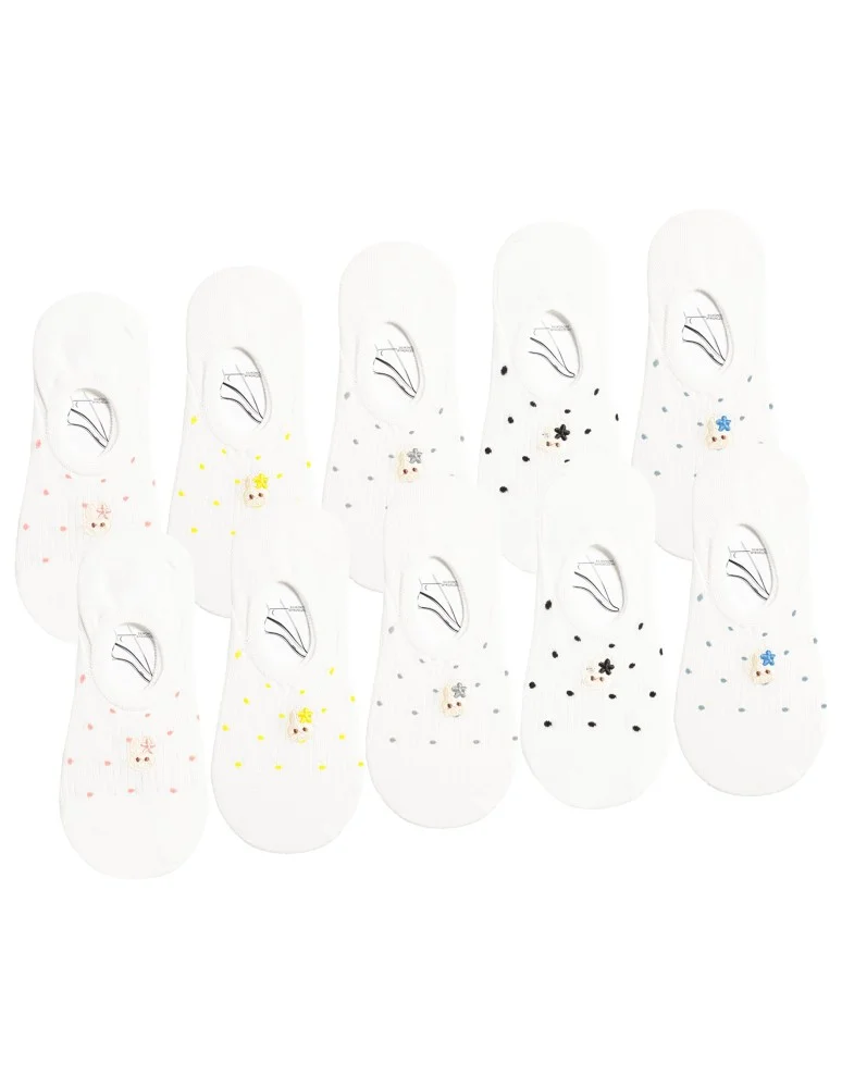 Przód wykończony jest delikatnym prążkowaniem, które poprawia dopasowanie i dodaje subtelnej struktury. Całość uzupełnia drobny haftowany motyw oraz minimalistyczne kropki, które nadają skarpetkom lekkości i kobiecego charakteru, ale bez przesady.