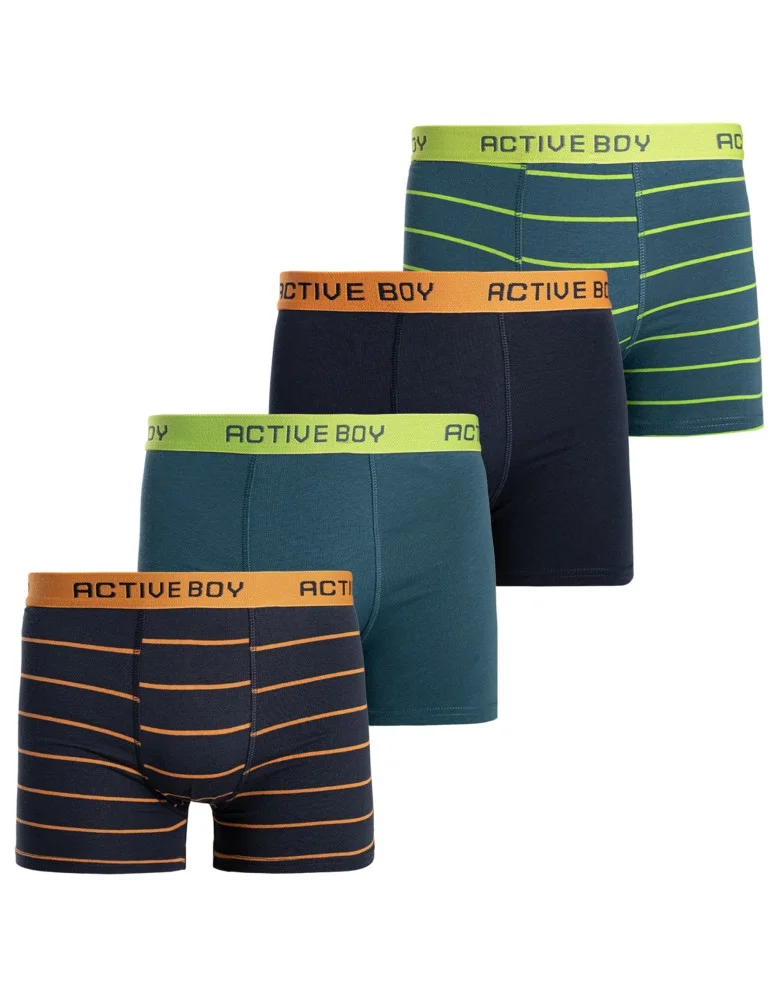 Komplet czterech par bokserek chłopięcych wykonany z wysokogatunkowej bawełny z domieszką elastycznych włókien. Zestaw składa się z dwóch par o gładkiej strukturze oraz dwóch par zdobionych klasycznymi, poziomymi paskami na całej powierzchni. Elementem wyróżniającym jest szeroka, elastyczna guma w pasie opatrzona dynamicznym napisem „ACTIVE BOY”. Materiał charakteryzuje się wysoką przewiewnością, miękkością oraz zdolnością do idealnego dopasowania się do sylwetki bez krępowania ruchów.