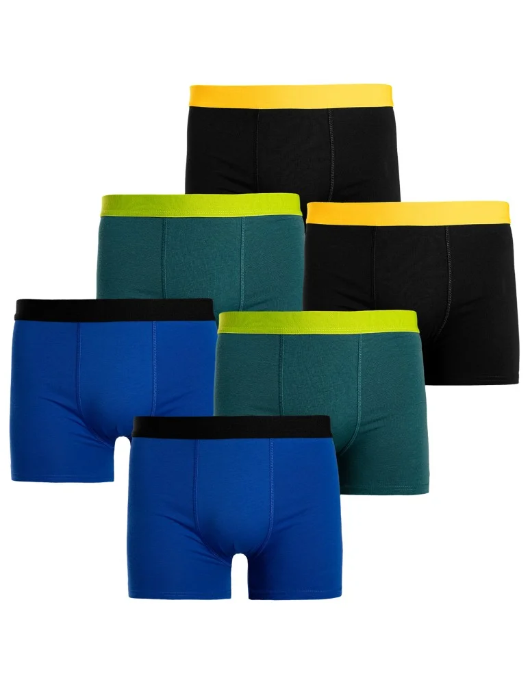 Zestaw sześciu par bokserek chłopięcych wykonany z wysokogatunkowej bawełny z domieszką elastycznych włókien. Konstrukcja charakteryzuje się jednolitym, gładkim materiałem korpusu oraz szeroką, elastyczną gumą w pasie w kontrastujących odcieniach. Fason typu regular fit zapewnia optymalne dopasowanie do sylwetki przy zachowaniu pełnej swobody ruchów podczas codziennych aktywności.