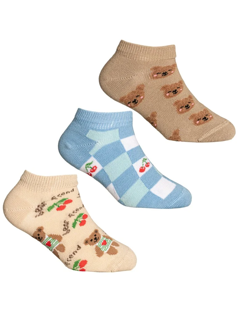 Skarpetki dziewczęce bawełniane z motywem misia i wisienek 3-pak WIELOKOLOROWY